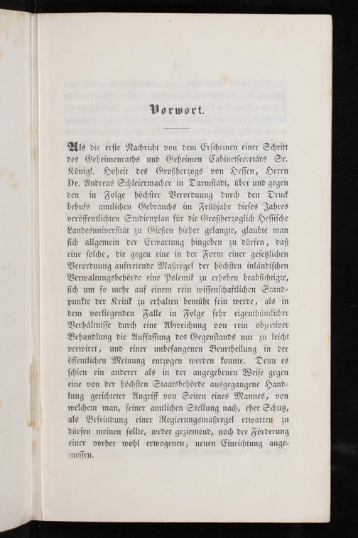 Als die erſte Nachricht von dem Erſcheinen einer Schrift des Geheimenraths und Geheimen Cabinetſecretärs Sr. Königl. Hoheit des Großherzogs von Heſſen, Herrn Dr. Andreas Schleiermacher in Darmſtadt, über und gegen den in Folge höchſter Verordnung durch den Druck behufs amtlichen Gebrauchs im Frühjahr dieſes Jahres veröffentlichten Studienplan für die Großherzoglich Heſſiſche Landesuniverſität zu Gießen hieher gelangte, glaubte man ſich allgemein der Erwartung hingeben zu dürfen, daß eine ſolche, die gegen eine in der Form einer geſetzlichen Verordnung auftretende Maßregel der höchſten inländiſchen Verwaltungsbehörde eine Polemik zu erheben beabſichtigte, ſich um ſo mehr auf einem rein wiſſenſchaftlichen Stand⸗ punkte der Kritik zu erhalten bemüht ſein werde, als in dem vorliegenden Falle in Folge ſehr eigenthümlicher Verhältniſſe durch eine Abweichung von rein objectiver Behandlung die Auffaſſung des Gegenſtands nur zu leicht verwirrt, und einer unbefangenen Beurtheilung in der öffentlichen Meinung entzogen werden konnte. Denn es ſchien ein anderer als in der angegebenen Weiſe gegen eine von der höchſten Staatsbehörde ausgegangene Hand⸗ lung gerichteter Angriff von Seiten eines Mannes, von welchem man, ſeiner amtlichen Stellung nach, eher Schutz, als Befeindung einer Regierungsmaßregel erwarten zu dürfen meinen ſollte, weder geziemend, noch der Förderung einer vorher wohl erwogenen, neuen Einrichtung ange⸗ meſſen.