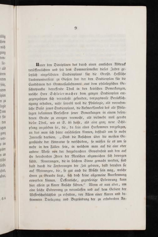 Unter den Disciplinen des durch einen amtlichen Abdruck veröffentlichten und ſeit dem Sommerſemeſter dieſes Jahrs ge⸗ ſetzlich eingeführten Studienplans für die Großh. Heſſiſche Landesuniverſität zu Gießen hat der den Studienplan für die Candidaten des Gymnaſiallehramts aus dem philologiſchen Ge⸗ ſichtspunkte betreffende Theil in den kritiſchen Bemerkungen, welche Herr Schleier macher dem ganzen Studienplan ent⸗ gegenzuſetzen ſich veranlaßt gefunden, vorzugsweiſe Berückſich⸗ tigung erhalten, nicht ſowohl weil die Philologie, als vornehm⸗ liche Baſis jenes Studienplans, die Aufmerkſamkeit des als Philo⸗ logen bekannten Verfaſſers jener Bemerkungen in einem beſon⸗ deren Grade zu erregen vermocht, als vielmehr weil gerade dieſer Theil, wie es S. 46 heißt, als eine ganz neue Schö⸗ pfung anzuſehen ſei, die, da kein altes Herkommen vorgelegen, an das man ſich hätte anſchließen können, deßhalb um ſo mehr Intereſſe darbiete.„Sind die Anſichten über die meiſten Ge genſtände der Litteratur ſo verſchieden, ſo müſſen ſie es um ſo mehr in den Fällen ſein, in welchem man auf die eine oder andere Weiſe von der hergebrachten Gewohnheit und den auf ihr beruhenden Ideen der Menſchen abzuweichen ſich bewogen fühlt. Neuerungen, die in ſolchem Sinne gemacht werden, ſind bald durch die Forderungen der Zeit geboten, bald beruhen ſie auf Meinungen, die, ſo gut auch die Abſicht ſein mag, welche ihnen zu Grunde liegt, ſich doch keine allgemeine Anerkennung erwerben können. Oeffentliche, gegenſeitige Erörterung kann hier allein zu klarer Anſicht führen.“ Wenn es nun aber, um eine ſolche Erörterung zu veranlaſſen und auf dem Gebiete der Wiſſenſchaftlichkeit zu erhalten, vor Allem einer klaren und be⸗ ſtimmten Darlegung und Begründung der zu erbebenden An⸗
