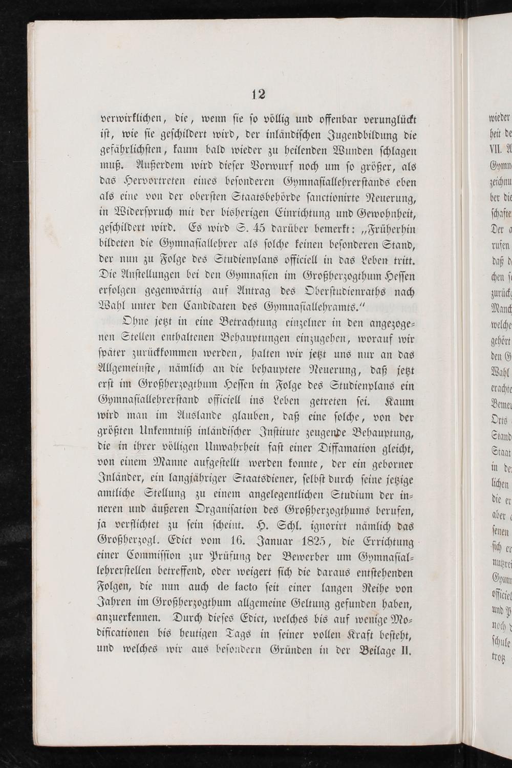 Ohne jetzt in eine Betrachtung einzelner in den angezoge⸗ nen Stellen enthaltenen Behauptungen einzugehen, worauf wir ſpäter zurückkommen werden, halten wir jetzt uns nur an das Allgemeinſte, nämlich an die behauptete Neuerung, daß jetzt erſt im Großherzogthum Heſſen in Folge des Studienplans ein Gymnaſiallehrerſtand officiell ins Leben getreten ſei. Kaum wird man im Auslande glauben, daß eine ſolche, von der größten Unkenntniß inländiſcher Inſtitute zeugende Behauptung, die in ihrer völligen Unwahrheit faſt einer Diffamation gleicht, von einem Manne aufgeſtellt werden konnte, der ein geborner Inländer, ein langjähriger Staatsdiener, ſelbſt durch ſeine jetzige amtliche Stellung zu einem angelegentlichen Studium der in— neren und äußeren Organiſation des Großherzogthums berufen, ja verflichtet zu ſein ſcheint. H. Schl. ignorirt nämlich das Großherzogl. Edict vom 16. Januar 1825, die Errichtung einer Commiſſion zur Prüfung der Bewerber um Gymnaſial⸗ lehrerſtellen betreffend, oder weigert ſich die daraus entſtehenden Folgen, die nun auch de facto ſeit einer langen Reihe von Jahren im Großherzogthum allgemeine Geltung gefunden haben, anzuerkennen. Durch dieſes Edict, welches bis auf wenige Mo⸗ dificationen bis heutigen Tags in ſeiner vollen Kraft beſteht, und welches wir aus beſondern Gründen in der Beilage II.