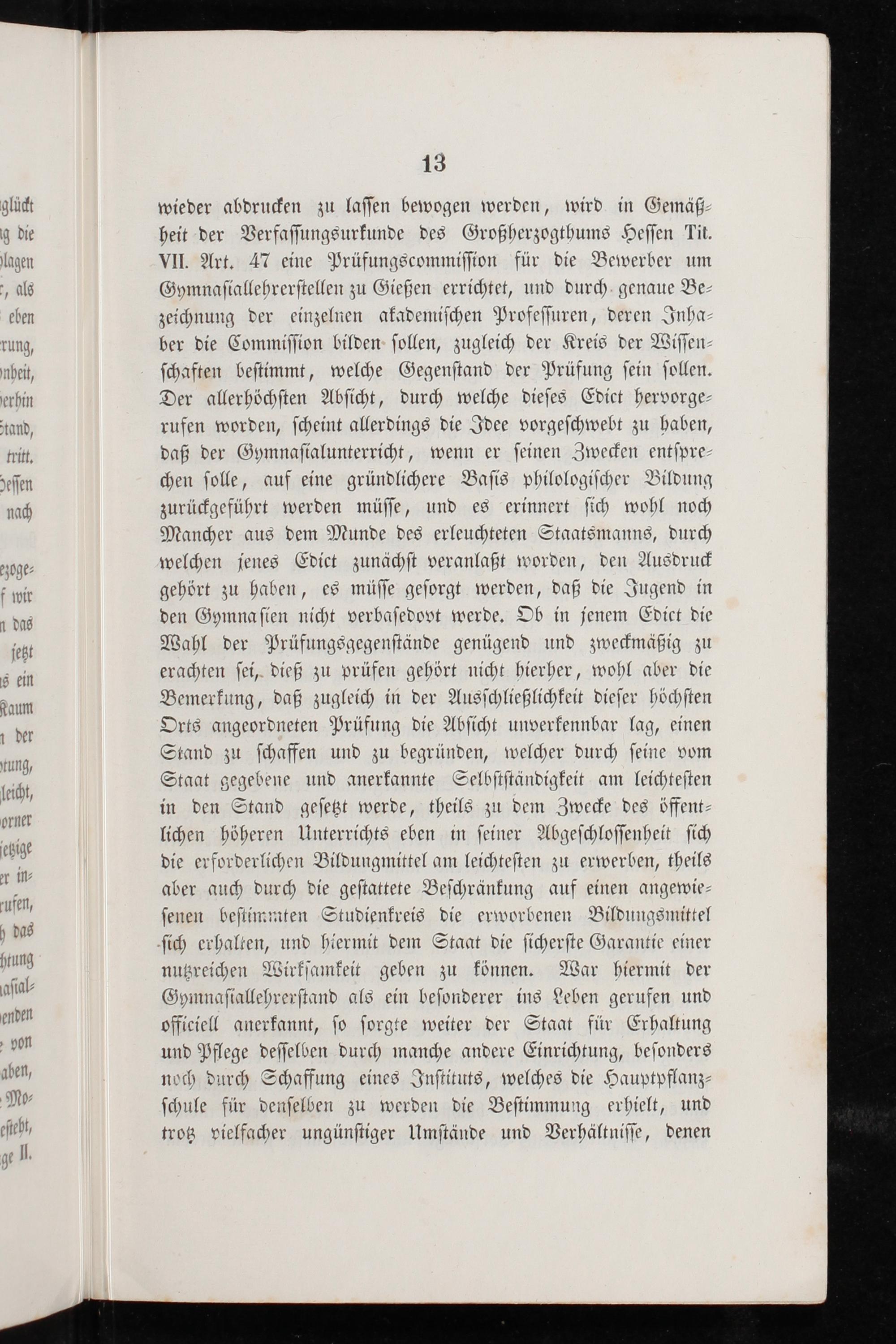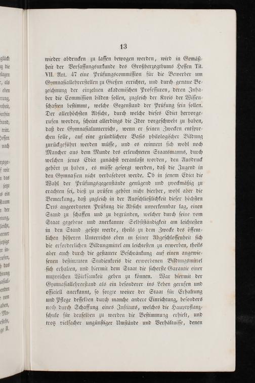 wieder abdrucken zu laſſen bewogen werden, wird in Gemäß⸗ heit der Verfaſſungsurkunde des Großherzogthums Heſſen Tit. VII. Art. 47 eine Prüfungscommiſſion für die Bewerber um Gymnaſiallehrerſtellen zu Gießen errichtet, und durch genaue Be⸗ zeichnung der einzelnen akademiſchen Profeſſuren, deren Inha⸗ ber die Commiſſion bilden ſollen, zugleich der Kreis der Wiſſen ſchaften beſtimmt, welche Gegenſtand der Prüfung ſein ſollen. Der allerhöchſten Abſicht, durch welche dieſes Edict hervorge⸗ rufen worden, ſcheint allerdings die Idee vorgeſchwebt zu haben, daß der Gymnaſialunterricht, wenn er ſeinen Zwecken entſpre⸗ chen ſolle, auf eine gründlichere Baſis philologiſcher Bildung zurückgeführt werden müſſe, und es erinnert ſich wohl noch Mancher aus dem Munde des erleuchteten Staatsmanns, durch welchen jenes Edict zunächſt veranlaßt worden, den Ausdruck gehört zu haben, es müſſe geſorgt werden, daß die Jugend in den Gymnaſien nicht verbaſedovt werde. Ob in jenem Edict die Wahl der Prüfungsgegenſtände genügend und zweckmäßig zu erachten ſei, dieß zu prüfen gehört nicht hierher, wohl aber die Bemerkung, daß zugleich in der Ausſchließlichkeit dieſer höchſten Orts angeordneten Prüfung die Abſicht unverkennbar lag, einen Stand zu ſchaffen und zu begründen, welcher durch ſeine vom Staat gegebene und anerkannte Selbſtſtändigkeit am leichteſten in den Stand geſetzt werde, theils zu dem Zwecke des öffent⸗ lichen höheren Unterrichts eben in ſeiner Abgeſchloſſenheit ſich die erforderlichen Bildungmittel am leichteſten zu erwerben, theils aber auch durch die geſtattete Beſchränkung auf einen angewie⸗ ſenen beſtimmten Studienkreis die erworbenen Bildungsmittel ſich erhalten, und hiermit dem Staat die ſicherſte Garantie einer nutzreichen Wirkſamkeit geben zu können. War hiermit der Gymnaſiallehrerſtand als ein beſonderer ins Leben gerufen und officiell anerkannt, ſo ſorgte weiter der Staat für Erhaltung und Pflege deſſelben durch manche andere Einrichtung, beſonders noch durch Schaffung eines Inſtituts, welches die Hauptpflanz⸗ ſchule für denſelben zu werden die Beſtimmung erhielt, und trotz vielfacher ungünſtiger Umſtände und Verhältniſſe, denen