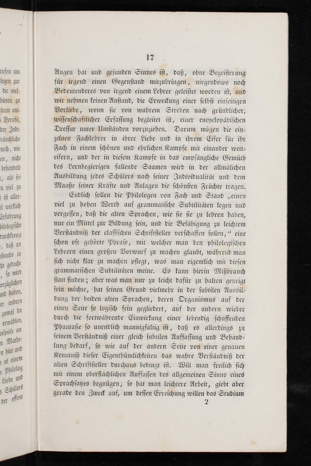 Augen hat und geſunden Sinnes iſt, daß, ohne Begeiſterung für irgend einen Gegenſtand mitzubringen, nirgendswo noch Bedeutenderes von irgend einem Lehrer geleiſtet worden iſt, und wir nehmen keinen Anſtand, die Erweckung einer ſelbſt einſeitigen Vorliebe, wenn ſie von wahrem Streben nach gründlicher, wiſſenſchaftlicher Erfaſſung begleitet iſt, einer encyclopädiſchen Dreſſur unter Umſtänden vorzuziehen. Darum mögen die ein⸗ zelnen Fachlehrer in ihrer Liebe und in ihrem Eifer für ihr Fach in einem ſchönen und ehrlichen Kampfe mit einander wett⸗ eifern, und der in dieſem Kampfe in das empfängliche Gemüth des Lernbegierigen fallende Saamen wird in der allmälichen Ausbildung jedes Schülers nach ſeiner Individualität und dem Maaße ſeiner Kräfte und Anlagen die ſchönſten Früchte tragen.