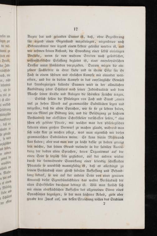 Endlich ſollen die Philologen von Fach und Stand„einen viel zu hohen Werth auf grammatiſche Subtilitäten legen und vergeſſen, daß die alten Sprachen, wie ſie ſie zu lehren haben, nur ein Mittel zur Bildung ſein, und die Befähigung zu leichtem Verſtändniß der claſſiſchen Schriftſteller verſchaffen ſollen,“ eine ſchon oft gehörte Phraſe, mit welcher man den philologiſchen Lehrern einen großen Vorwurf zu machen glaubt, während man ſich nicht klar zu machen pflegt, was man eigentlich mit dieſen grammatiſchen Subtilitäten meine. Es kann hierin Mißbrauch ſtatt finden; aber was man nur zu leicht dafür zu halten geneigt ſein möchte, hat ſeinen Grund vielmehr in der ſubtilen Ausbil⸗ dung der beiden alten Sprachen, deren Organismus auf der einen Seite ſo logiſch fein gegliedert, auf der andern wieder durch die fortwährende Einwirkung einer lebendig ſchaffenden Phantaſie ſo unendlich mannigfaltig iſt, daß es allerdings zu ſeinem Verſtändniß einer gleich ſubtilen Auffaſſung und Behand⸗ lung bedarf, ſo wie auf der andern Seite von einer genauen Kenntniß dieſer Eigenthümlichkeiten das wahre Verſtändniß der alten Schriftſteller durchaus bedingt iſt. Will man freilich ſich mit einem oberflächlichen Auffaſſen des allgemeinen Sinns eines Sprachſatzes begnügen, ſo hat man leichtere Arbeit, giebt aber gerade den Zweck auf, um deſſen Erreichung willen das Studium