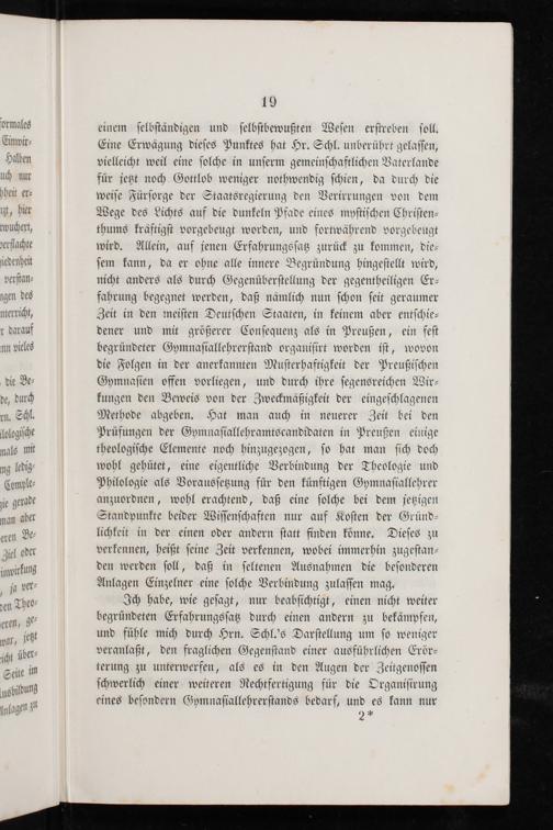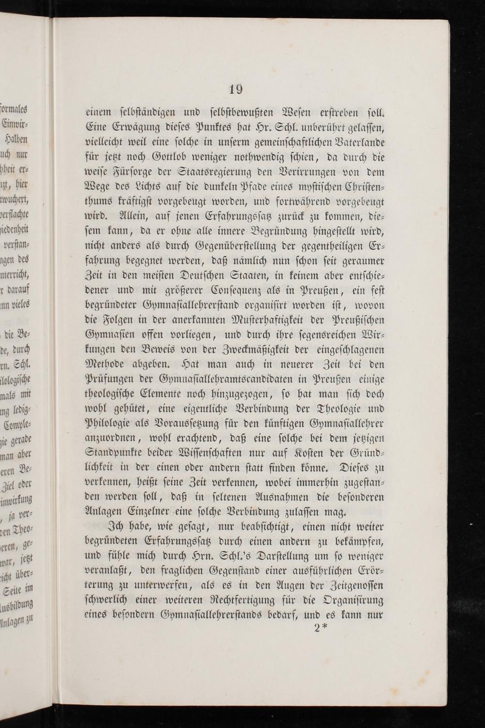 einem ſelbſtändigen und ſelbſtbewußten Weſen erſtreben ſoll. Eine Erwägung dieſes Punktes hat Hr. Schl. unberührt gelaſſen, vielleicht weil eine ſolche in unſerm gemeinſchaftlichen Vaterlande für jetzt noch Gottlob weniger nothwendig ſchien, da durch die weiſe Fürſorge der Staatsregierung den Verirrungen von dem Wege des Lichts auf die dunkeln Pfade eines myſtiſchen Chriſten⸗ thums kräftigſt vorgebeugt worden, und fortwährend vorgebeugt wird. Allein, auf jenen Erfahrungsſatz zurück zu kommen, die⸗ ſem kann, da er ohne alle innere Begründung hingeſtellt wird, nicht anders als durch Gegenüberſtellung der gegentheiligen Er⸗ fahrung begegnet werden, daß nämlich nun ſchon ſeit geraumer Zeit in den meiſten Deutſchen Staaten, in keinem aber entſchie⸗ dener und mit größerer Conſequenz als in Preußen, ein feſt begründeter Gymnaſiallehrerſtand organiſirt worden iſt, wovon die Folgen in der anerkannten Muſterhaftigkeit der Preußiſchen Gymnaſien offen vorliegen, und durch ihre ſegensreichen Wir⸗ kungen den Beweis von der Zweckmäßigkeit der eingeſchlagenen Methode abgeben. Hat man auch in neuerer Zeit bei den Prüfungen der Gymnaſiallehramtscandidaten in Preußen einige theologiſche Elemente noch hinzugezogen, ſo hat man ſich doch wohl gehütet, eine eigentliche Verbindung der Theologie und Philologie als Vorausſetzung für den künftigen Gymnaſiallehrer anzuordnen, wohl erachtend, daß eine ſolche bei dem jetzigen Standpunkte beider Wiſſenſchaften nur auf Koſten der Gründ⸗ lichkeit in der einen oder andern ſtatt finden könne. Dieſes zu verkennen, heißt ſeine Zeit verkennen, wobei immerhin zugeſtan⸗ den werden ſoll, daß in ſeltenen Ausnahmen die beſonderen Anlagen Einzelner eine ſolche Verbindung zulaſſen mag.