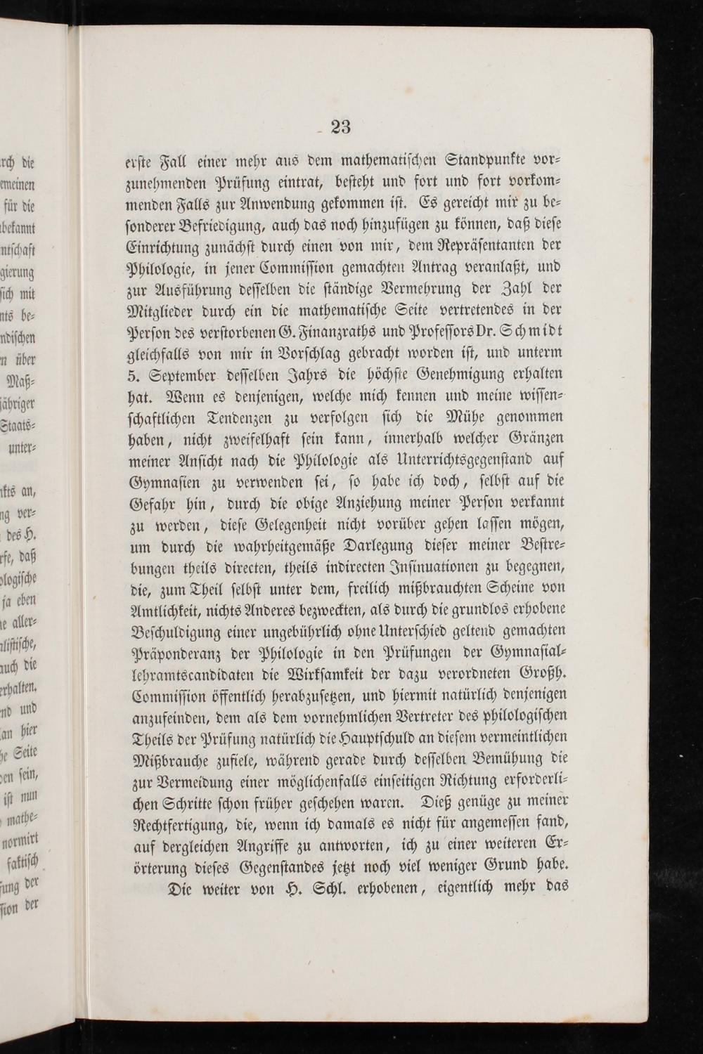 erſte Fall einer mehr aus dem mathematiſchen Standpunkte vor⸗ zunehmenden Prüfung eintrat, beſteht und fort und fort vorkom⸗ menden Falls zur Anwendung gekommen iſt. Es gereicht mir zu be⸗ ſonderer Befriedigung, auch das noch hinzufügen zu können, daß dieſe Einrichtung zunächſt durch einen von mir, dem Repräſentanten der Philologie, in jener Commiſſion gemachten Antrag veranlaßt, und zur Ausführung deſſelben die ſtändige Vermehrung der Zahl der Mitglieder durch ein die mathematiſche Seite vertretendes in der Perſon des verſtorbenen G. Finanzraths und Profeſſors Dr. Schmidt gleichfalls von mir in Vorſchlag gebracht worden iſt, und unterm 5. September deſſelben Jahrs die höchſte Genehmigung erhalten hat. Wenn es denjenigen, welche mich kennen und meine wiſſen⸗ ſchaftlichen Tendenzen zu verfolgen ſich die Mühe genommen haben, nicht zweifelhaft ſein kann, innerhalb welcher Gränzen meiner Anſicht nach die Philologie als Unterrichtsgegenſtand auf Gymnaſien zu verwenden ſei, ſo habe ich doch, ſelbſt auf die Gefahr hin, durch die obige Anziehung meiner Perſon verkannt zu werden, dieſe Gelegenheit nicht vorüber gehen laſſen mögen, um durch die wahrheitgemäße Darlegung dieſer meiner Beſtre⸗ bungen theils directen, theils indirecten Inſinuationen zu begegnen, die, zum Theil ſelbſt unter dem, freilich mißbrauchten Scheine von Amtlichkeit, nichts Anderes bezweckten, als durch die grundlos erhobene Beſchuldigung einer ungebührlich ohne Unterſchied geltend gemachten Präponderanz der Philologie in den Prüfungen der Gymnaſial⸗ lehramtscandidaten die Wirkſamkeit der dazu verordneten Großh. Commiſſion öffentlich herabzuſetzen, und hiermit natürlich denjenigen anzufeinden, dem als dem vornehmlichen Vertreter des philologiſchen Theils der Prüfung natürlich die Hauptſchuld an dieſem vermeintlichen Mißbrauche zufiele, während gerade durch deſſelben Bemühung die zur Vermeidung einer möglichenfalls einſeitigen Richtung erforderli⸗ chen Schritte ſchon früher geſchehen waren. Dieß genüge zu meiner Rechtfertigung, die, wenn ich damals es nicht für angemeſſen fand, auf dergleichen Angriffe zu antworten, ich zu einer weiteren Er⸗ örterung dieſes Gegenſtandes jetzt noch viel weniger Grund habe.