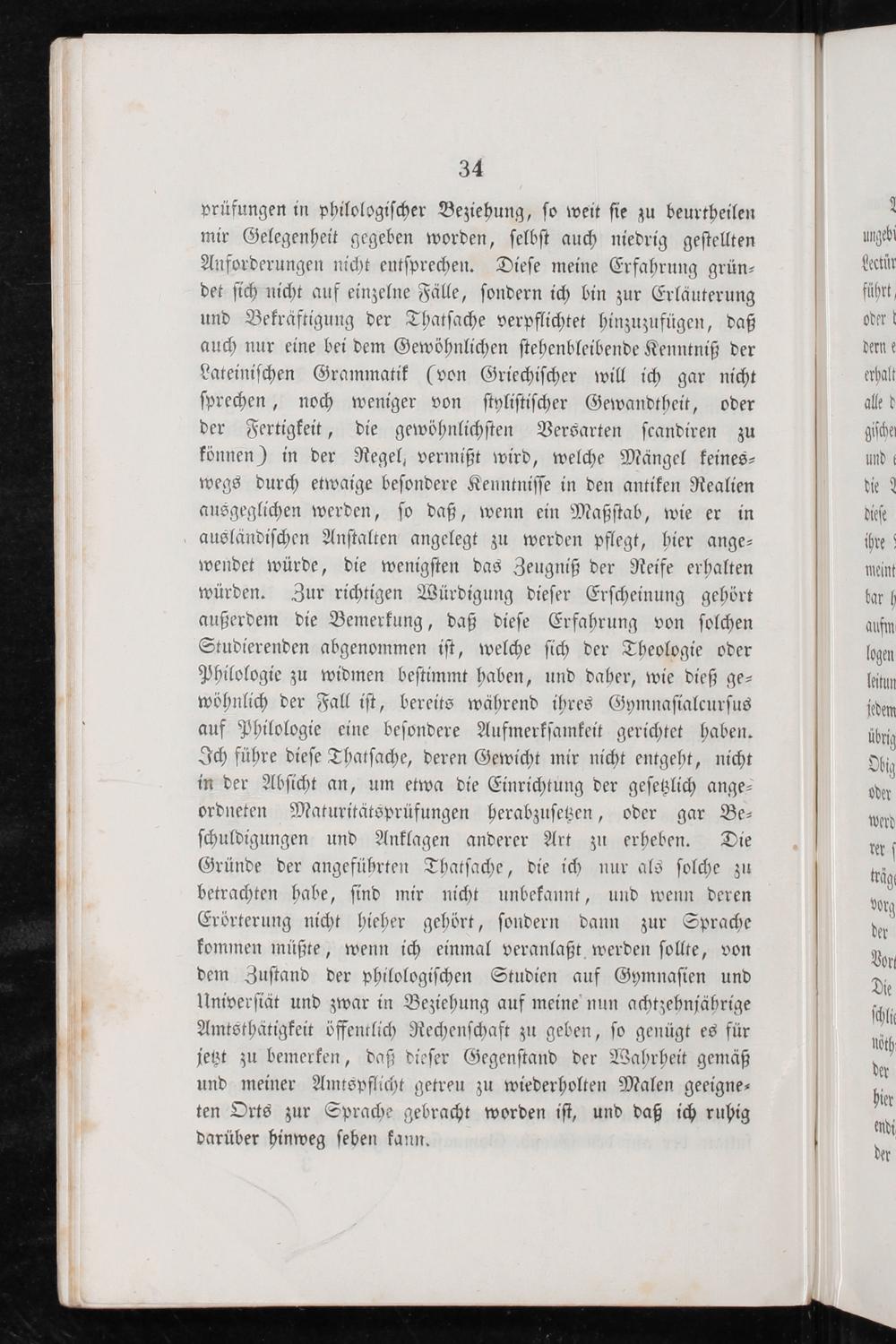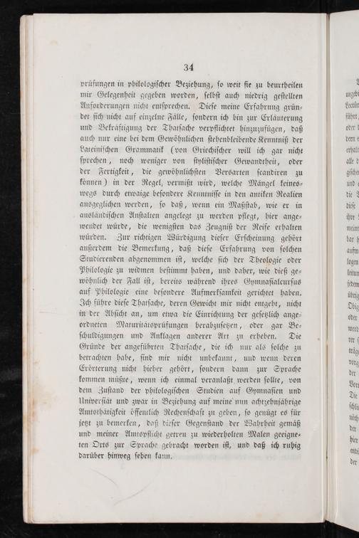 prüfungen in philologiſcher Beziehung, ſo weit ſie zu beurtheilen mir Gelegenheit gegeben worden, ſelbſt auch niedrig geſtellten Anforderungen nicht entſprechen. Dieſe meine Erfahrung grün⸗ det ſich nicht auf einzelne Fälle, ſondern ich bin zur Erlaͤuterung und Bekräftigung der Thatſache verpflichtet hinzuzufügen, daß auch nur eine bei dem Gewöhnlichen ſtehenbleibende Kenntniß der Lateiniſchen Grammatik(von Griechiſcher will ich gar nicht ſprechen, noch weniger von ſtyliſtiſcher Gewandtheit, oder der Fertigkeit, die gewöhnlichſten Versarten ſcandiren zu können) in der Regel, vermißt wird, welche Mängel keines⸗ wegs durch etwaige beſondere Kenntniſſe in den antiken Realien ausgeglichen werden, ſo daß, wenn ein Maßſtab, wie er in ausländiſchen Anſtalten angelegt zu werden pflegt, hier ange⸗ wendet würde, die wenigſten das Zeugniß der Reife erhalten würden. Zur richtigen Würdigung dieſer Erſcheinung gehört außerdem die Bemerkung, daß dieſe Erfahrung von ſolchen Studierenden abgenommen iſt, welche ſich der Theologie oder Philologie zu widmen beſtimmt haben, und daher, wie dieß ge⸗ wöhnlich der Fall iſt, bereits während ihres Gymnaſialcurſus auf Philologie eine beſondere Aufmerkſamkeit gerichtet haben. Ich führe dieſe Thatſache, deren Gewicht mir nicht entgeht, nicht in der Abſicht an, um etwa die Einrichtung der geſetzlich ange⸗ ordneten Maturitätsprüfungen herabzuſetzen, oder gar Be⸗ ſchuldigungen und Anklagen anderer Art zu erheben. Die Gründe der angeführten Thatſache, die ich nur als ſolche zu betrachten habe, ſind mir nicht unbekannt, und wenn deren Erörterung nicht hieher gehört, ſondern dann zur Sprache kommen müßte, wenn ich einmal veranlaßt werden ſollte, von dem Zuſtand der philologiſchen Studien auf Gymnaſien und Univerſiät und zwar in Beziehung auf meine nun achtzehnjährige Amtsthätigkeit öffentlich Rechenſchaft zu geben, ſo genügt es für jetzt zu bemerken, daß dieſer Gegenſtand der Wahrheit gemäß und meiner Amtspflicht getreu zu wiederholten Malen geeigne⸗ ten Orts zur Sprache gebracht worden iſt, und daß ich ruhig darüber hinweg ſeben kann.