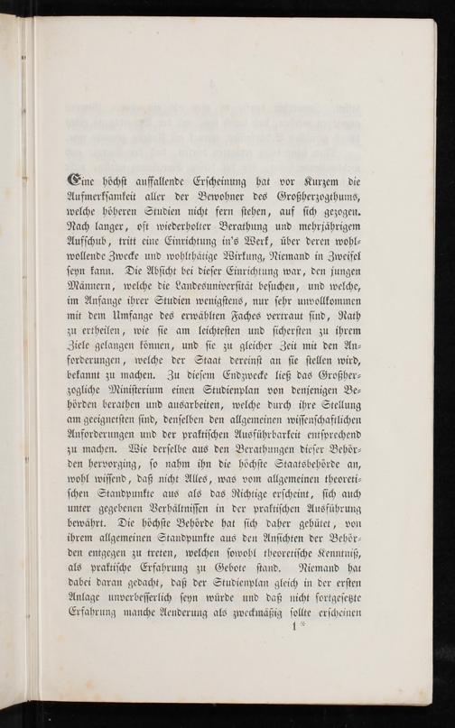 Eine höchſt auffallende Erſcheinung hat vor Kurzem die Aufmerkſamkeit aller der Bewohner des Großherzogthums, welche höheren Studien nicht fern ſtehen, auf ſich gezogen. Nach langer, oft wiederholter Berathung und mehrjährigem Aufſchub, tritt eine Einrichtung in's Werk, über deren wohl⸗ wollende Zwecke und wohlthätige Wirkung, Niemand in Zweifel ſeyn kann. Die Abſicht bei dieſer Einrichtung war, den jungen Männern, welche die Landesuniverſität beſuchen, und welche, im Anfange ihrer Studien wenigſtens, nur ſehr unvollkommen mit dem Umfange des erwählten Faches vertraut ſind, Rath zu ertheilen, wie ſie am leichteſten und ſicherſten zu ihrem Ziele gelangen können, und ſie zu gleicher Zeit mit den An⸗ forderungen, welche der Staat dereinſt an ſie ſtellen wird, bekannt zu machen. Zu dieſem Endzwecke ließ das Großher⸗ zogliche Miniſterium einen Studienplan von denjenigen Be⸗ hörden berathen und ausarbeiten, welche durch ihre Stellung am geeignetſten ſind, denſelben den allgemeinen wiſſenſchaftlichen Anforderungen und der praktiſchen Ausführbarkeit entſprechend zu machen. Wie derſelbe aus den Berathungen dieſer Behör⸗ den hervorging, ſo nahm ihn die höchſte Staatsbehörde an, wohl wiſſend, daß nicht Alles, was vom allgemeinen theoreti⸗ ſchen Standpunkte aus als das Richtige erſcheint, ſich auch unter gegebenen Verhältniſſen in der praktiſchen Ausführung bewährt. Die höchſte Behörde hat ſich daher gehütet, von ihrem allgemeinen Standpunkte aus den Anſichten der Behör⸗ den entgegen zu treten, welchen ſowohl theoretiſche Kenntniß, als praktiſche Erfahrung zu Gebote ſtand. Niemand hat dabei daran gedacht, daß der Studienplan gleich in der erſten Anlage unverbeſſerlich ſeyn würde und daß nicht fortgeſetzte Erfahrung manche Aenderung als zweckmäßig ſollte erſcheinen 14