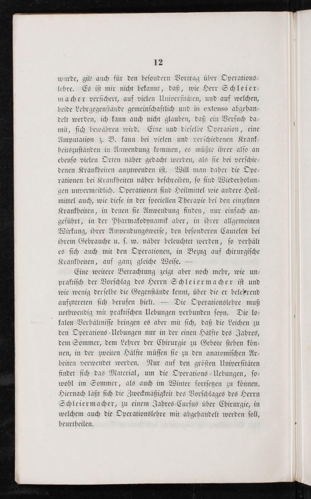 wurde, gilt auch für den beſondern Vortrag über Operations⸗ lehre. Es iſt mir nicht bekannt, daß, wie Herr Schleier⸗ macher verſichert, auf vielen Univerſitäten, und auf welchen, beide Lehrgegenſtände gemeinſchaftlich und in extenso abgehan⸗ delt werden, ich kann auch nicht glauben, daß ein Verſuch da⸗ mit, ſich bewähren wird. Eine und dieſelbe Operation, eine Amputation z. B. kann bei vielen und verſchiedenen Krank⸗ heitszuſtänden in Anwendung kommen, es müßte ihrer alſo an ebenſo vielen Orten näher gedacht werden, als ſie bei verſchie⸗ denen Krankheiten anzuwenden iſt. Will man daher die Ope⸗ rationen bei Krankheiten näher beſchreiben, ſo ſind Wiederholun⸗ gen unvermeidlich. Operationen ſind Heilmittel wie andere Heil⸗ mittel auch, wie dieſe in der ſpeciellen Therapie bei den einzelnen Krankheiten, in denen ſie Anwendung finden, nur einfach an⸗ geführt, in der Pharmakodynamik aber, in ihrer allgemeinen Wirkung, ihrer Anwendungsweiſe, den beſonderen Cautelen bei ihrem Gebrauche u. ſ. w. näher beleuchtet werden, ſo verhält es ſich auch mit den Operationen, in Bezug auf chirurgiſche Krankheiten, auf ganz gleiche Weiſe.—