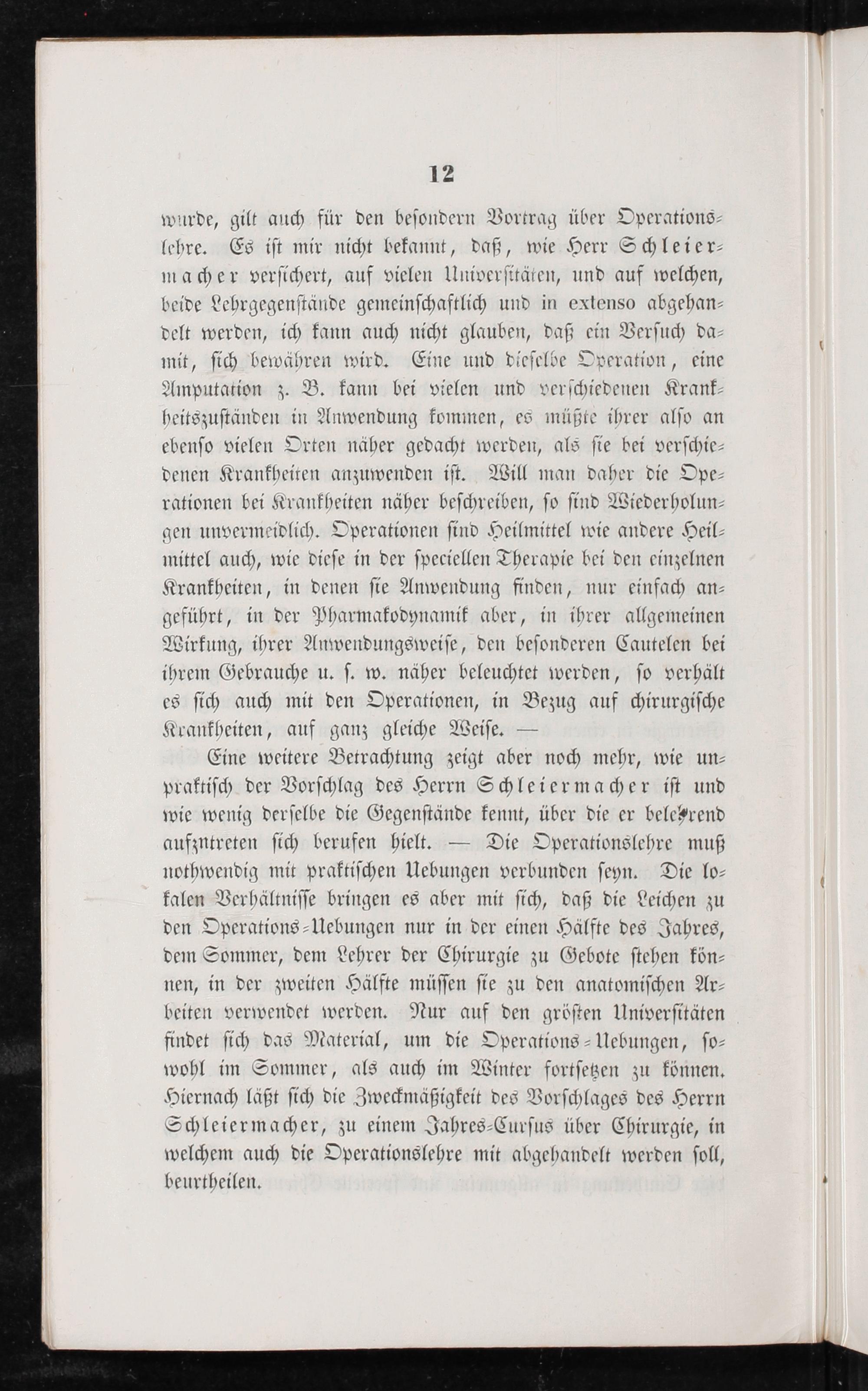 Eine weitere Betrachtung zeigt aber noch mehr, wie un⸗ praktiſch der Vorſchlag des Herrn Schleiermacher iſt und wie wenig derſelbe die Gegenſtände kennt, über die er belebrend aufzyutreten ſich berufen hielt.— Die Operationslehre muß nothwendig mit praktiſchen Uebungen verbunden ſeyn. Die lo⸗ kalen Verhältniſſe bringen es aber mit ſich, daß die Leichen zu den Operations⸗Uebungen nur in der einen Hälfte des Jahres, dem Sommer, dem Lehrer der Chirurgie zu Gebote ſtehen kön⸗ nen, in der zweiten Hälfte müſſen ſie zu den anatomiſchen Ar⸗ beiten verwendet werden. Nur auf den gröſten Univerſitäten findet ſich das Material, um die Operations⸗Uebungen, ſo⸗ wohl im Sommer, als auch im Winter fortſetzen zu können. Hiernach läßt ſich die Zweckmäßigkeit des Vorſchlages des Herrn Schleiermacher, zu einem Jahres⸗Curſus über Chirurgie, in welchem auch die Operationslehre mit abgehandelt werden ſoll, beurtheilen.