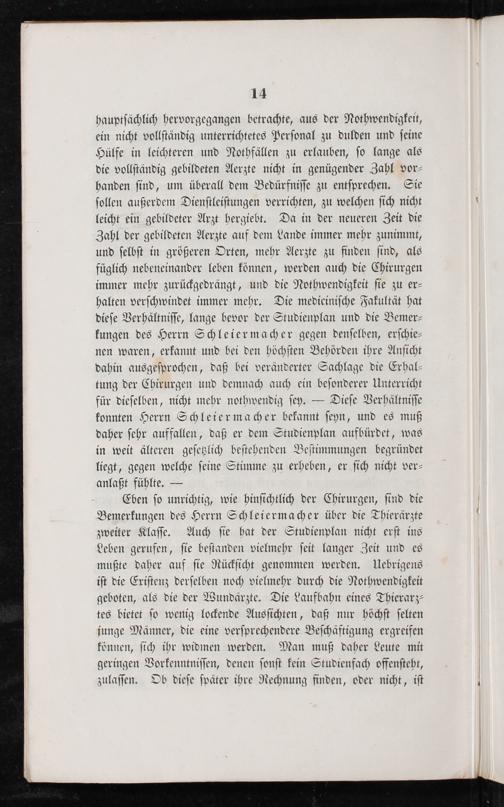 hauptſächlich hervorgegangen betrachte, aus der Nothwendigkeit, ein nicht vollſtändig unterrichtetes Perſonal zu dulden und ſeine Hülfe in leichteren und Nothfällen zu erlauben, ſo lange als die vollſtändig gebildeten Aerzte nicht in genügender Zahl vor⸗ handen ſind, um überall dem Bedürfniſſe zu entſprechen. Sie ſollen außerdem Dienſtleiſtungen verrichten, zu welchen ſich nicht leicht ein gebildeter Arzt hergiebt. Da in der neueren Zeit die Zahl der gebildeten Aerzte auf dem Lande immer mehr zunimmt, und ſelbſt in größeren Orten, mehr Aerzte zu finden ſind, als füglich nebeneinander leben können, werden auch die Chirurgen immer mehr zurückgedrängt, und die Nothwendigkeit ſie zu er⸗ halten verſchwindet immer mehr. Die mediciniſche Fakultät hat dieſe Verhältniſſe, lange bevor der Studienplan und die Bemer⸗ kungen des Herrn Schleiermacher gegen denſelben, erſchie⸗ nen waren, erkannt und bei den höchſten Behörden ihre Anſicht dahin ausgeſprochen, daß bei veränderter Sachlage die Erhal⸗ tung der Chirurgen und demnach auch ein beſonderer Unterricht für dieſelben, nicht mehr nothwendig ſey.— Dieſe Verhältniſſe konnten Herrn Schleiermacher bekannt ſeyn, und es muß daher ſehr auffallen, daß er dem Studienplan aufbürdet, was in weit älteren geſetzlich beſtehenden Beſtimmungen begründet liegt, gegen welche ſeine Stimme zu erheben, er ſich nicht ver⸗ anlaßt fühlte.—