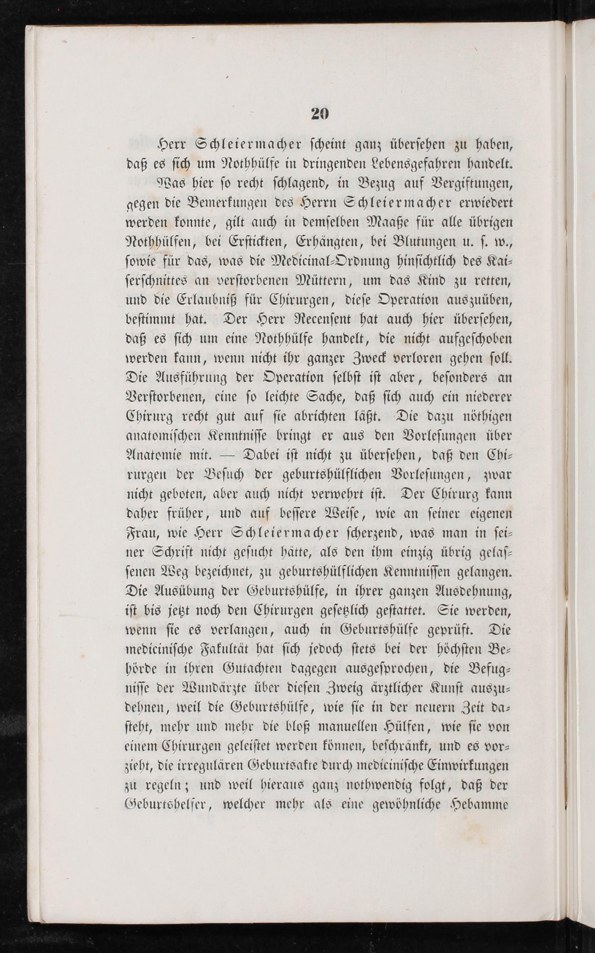 Was hier ſo recht ſchlagend, in Bezug auf Vergiftungen, gegen die Bemerkungen des Herrn Schleiermacher erwiedert werden konnte, gilt auch in demſelben Maaße für alle übrigen Nothhülfen, bei Erſtickten, Erhängten, bei Blutungen u. ſ. w., ſowie für das, was die Medicinal⸗Ordnung hinſichtlich des Kai⸗ ſerſchnittes an verſtorbenen Müttern, um das Kind zu retten, und die Erlaubniß für Chirurgen, dieſe Operation auszuüben, beſtimmt hat. Der Herr Recenſent hat auch hier überſehen, daß es ſich um eine Nothhülfe handelt, die nicht aufgeſchoben werden kann, wenn nicht ihr ganzer Zweck verloren gehen ſoll. Die Ausführung der Operation ſelbſt iſt aber, beſonders an Verſtorbenen, eine ſo leichte Sache, daß ſich auch ein niederer Chirurg recht gut auf ſie abrichten läßt. Die dazu nöthigen anatomiſchen Kenntniſſe bringt er aus den Vorleſungen über Anatomie mit.— Dabei iſt nicht zu überſehen, daß den Chi⸗ rurgen der Beſuch der geburtshülflichen Vorleſungen, zwar nicht geboten, aber auch nicht verwehrt iſt. Der Chirurg kann daher früher, und auf beſſere Weiſe, wie an ſeiner eigenen Frau, wie Herr Schleiermacher ſcherzend, was man in ſei⸗ ner Schrift nicht geſucht hätte, als den ihm einzig übrig gelaſ⸗ ſenen Weg bezeichnet, zu geburtshülflichen Kenntniſſen gelangen. Die Ausübung der Geburtshülfe, in ihrer ganzen Ausdehnung, iſt bis jetzt noch den Chirurgen geſetzlich geſtattet. Sie werden, wenn ſie es verlangen, auch in Geburtshülfe geprüft. Die mediciniſche Fakultät hat ſich jedoch ſtets bei der höchſten Be⸗ hörde in ihren Gutachten dagegen ausgeſprochen, die Befug⸗ niſſe der Wundärzte über dieſen Zweig ärztlicher Kunſt auszu⸗ dehnen, weil die Geburtshülfe, wie ſie in der neuern Zeit da⸗ ſteht, mehr und mehr die bloß manuellen Hülfen, wie ſie von einem Chirurgen geleiſtet werden können, beſchränkt, und es vor⸗ zieht, die irregulären Geburtsakte durch mediciniſche Einwirkungen zu regeln; und weil hieraus ganz nothwendig folgt, daß der Geburtshelfer, welcher mehr als eine gewöhnliche Hebamme