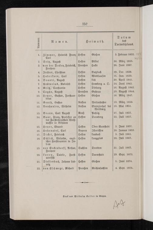 Namen. Heimath. Doctordiploms. Zimmer, Heinrich Franz Heſſen Gießen 5. Februar 1832. 11f Carl AAA Seitz, Auguſt Heſſen Vilbel 30. März 1835. von der Decken, Friedrich, Preußen Halle 26. Juni 1837. Freiherr Juſtus, Chriſtian Heſſen Butzbach 29. Dec. 1838. Haberkorn, Carl Heſſen Windhauſen 21. Jan. 1839. Draudt, Auguſt Heſſen Lich 30. April 1841. Prätorius, Rudolph Heſſen Homberg a. O. 24. Juni 1842. Reitz, Conſtantin Heſſen Dieburg 16. Auguſt 1842. Cogho, Auguſt Preußen Guhrau 19. Auguſt 1844. Heyer, Guſtav, Forſtcan⸗ Heſſen Gießen 16. März 1847. didat Genth, Guſtav Naſſau Weilmünſter 13. März 1850. Vonhauſen, Wilhelm Naſſau Steinzlerhof bei 123. Mai 1851. Weilburg Braun, Carl Auguſt Reuß Pohlitz 27. Juli 1857. Baur, Franz, Profeſſor an Heſſen Dornberg 22. Juli 1857. der Forſtlehranſtalt Weiß⸗ waſſer in Böhmen Heyer, Eduard Heſſen Ober⸗Ramſtadt 3. Juni 1857. Hohenadel, Carl Bayern AKllertiſſen 28. Januar 1859. .—— Dickel, Friedrich Heſſen Laubach 3. Juli 1861. Schlich, Wilhelm, engli⸗ Heſſen Langgöns 20. Juli 1867. ſcher Forſtbeamter in In⸗ dien von Seckendorff, Arthur, Sachſen Dresden 31. Juli 1867. Freiherr Lorey, Tuisko, Forſt⸗ Heſſen Darmſtadt 29. Sept. 1873. acceſſiſt G Dieffenbach, Johann Lud⸗ Heſſen Gießen 1. Juni 1874. wig von Eſchwege, Richard Preußen Reichenſachſen 4. Sept. 1876. W ——