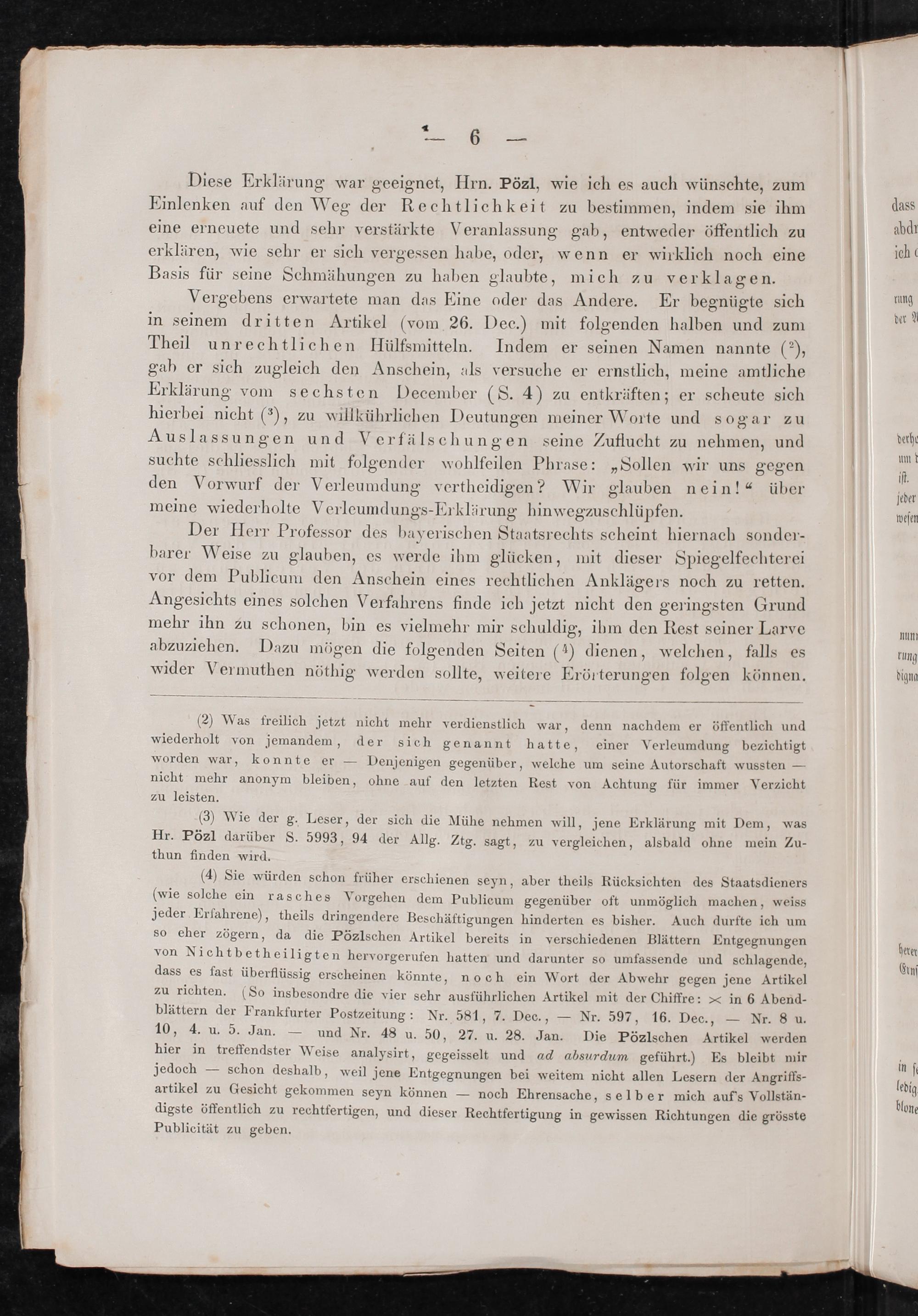 (4) Sie würden schon früher erschienen seyn, aber theils Rücksichten des Staatsdieners (wie solche ein rasches Vorgehen dem Publicum gegenüber oft unmöglich machen, weiss jeder Erfahrene), theils dringendere Beschäftigungen hinderten es bisher. Auch durfte ich um so eher zögern, da die Pözlschen Artikel bereits in verschiedenen Blättern Entgegnungen von Nichtbetheiligten hervorgerufen hatten und darunter so umfassende und schlagende, dass es fast überflüssig erscheinen könnte,