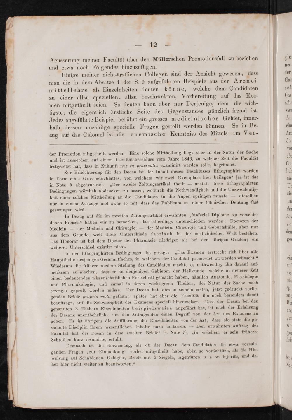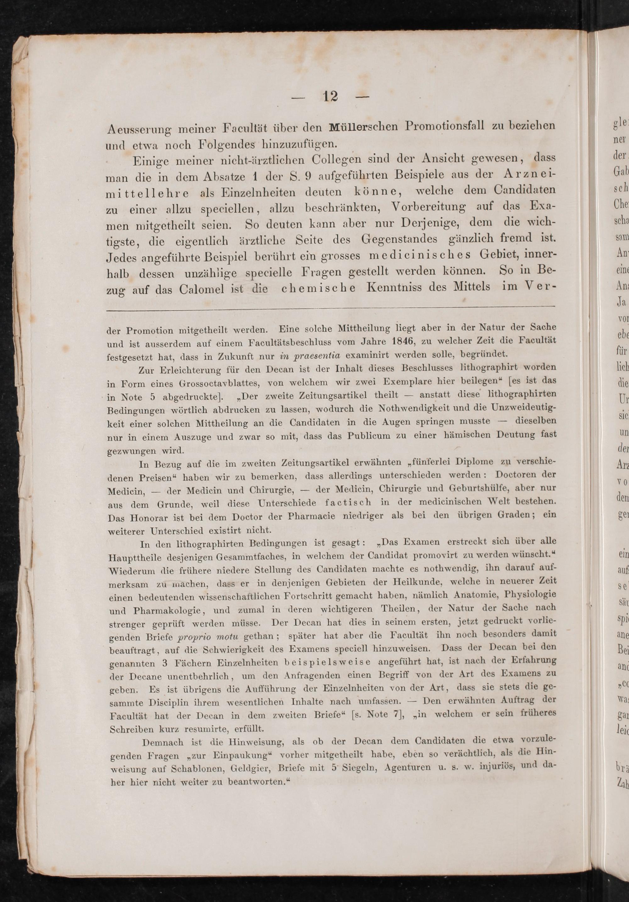 In den lithographirten Bedingungen ist gesagt:„Das Examen erstreckt sich über alle Haupttheile desjenigen Gesammtfaches, in welchem der Candidat promovirt zu werden wünscht.“ Wiederum die frühere niedere Stellung des Candidaten machte es nothwendig, ihn darauf auf- merksam zu machen, dass er in denjenigen Gebieten der Heilkunde, welche in neuerer Zeit einen bedeutenden wissenschaftlichen Fortschritt gemacht haben, nämlich Anatomie, Physiologie und Pharmakologie, und zumal in deren wichtigeren Theilen, der Natur der Sache nach strenger geprüft werden müsse. Der Decan hat dies in seinem ersten, jetzt gedruckt vorlie- genden Briefe proprio motu gethan; später hat aber die Facultät ihn noch besonders damit beauftragt, auf die Schwierigkeit des Examens speciell hinzuweisen. Dass der Decan bei den genannten 3 Fächern Einzelnheiten beispielsweise angeführt hat, ist nach der Erfahrung der Decane unentbehrlich, um den Anfragenden einen Begriff von der Art des Examens zu geben. Es ist übrigens die Aufführung der Einzelnheiten von der Art, dass sie stets die ge- sammte Disciplin ihrem wesentlichen Inhalte nach umfassen.— Den erwähnten Auftrag der Pacultät hat der Decan in dem zweiten Briefe“[s. Note 7],„in welchem er sein früheres Schreiben kurz resumirte, erfüllt.
