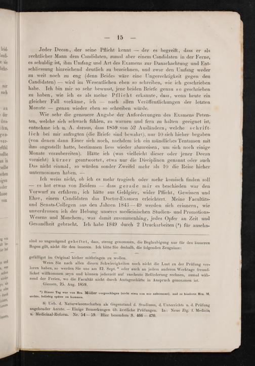 *) Dieser Tag war von Irn. Müller vorgeschlagen(nicht etwa von mir anberaumt), und es hinderte Hrn. M. nichts, beliebig später zu kommen. 8) Ueb. d. Naturwissenschaften als Gegenstand d. Studiums, d. Unterrichts u. d. Prüfung angehender KAerzte.— Einige Bemerkungen üb. ärztliche Prüfungen. In: Neue Ztg. f. Medicin u. Medicinal-Reform. Nr. 54— 59. Hier besonders S. 466— 470.