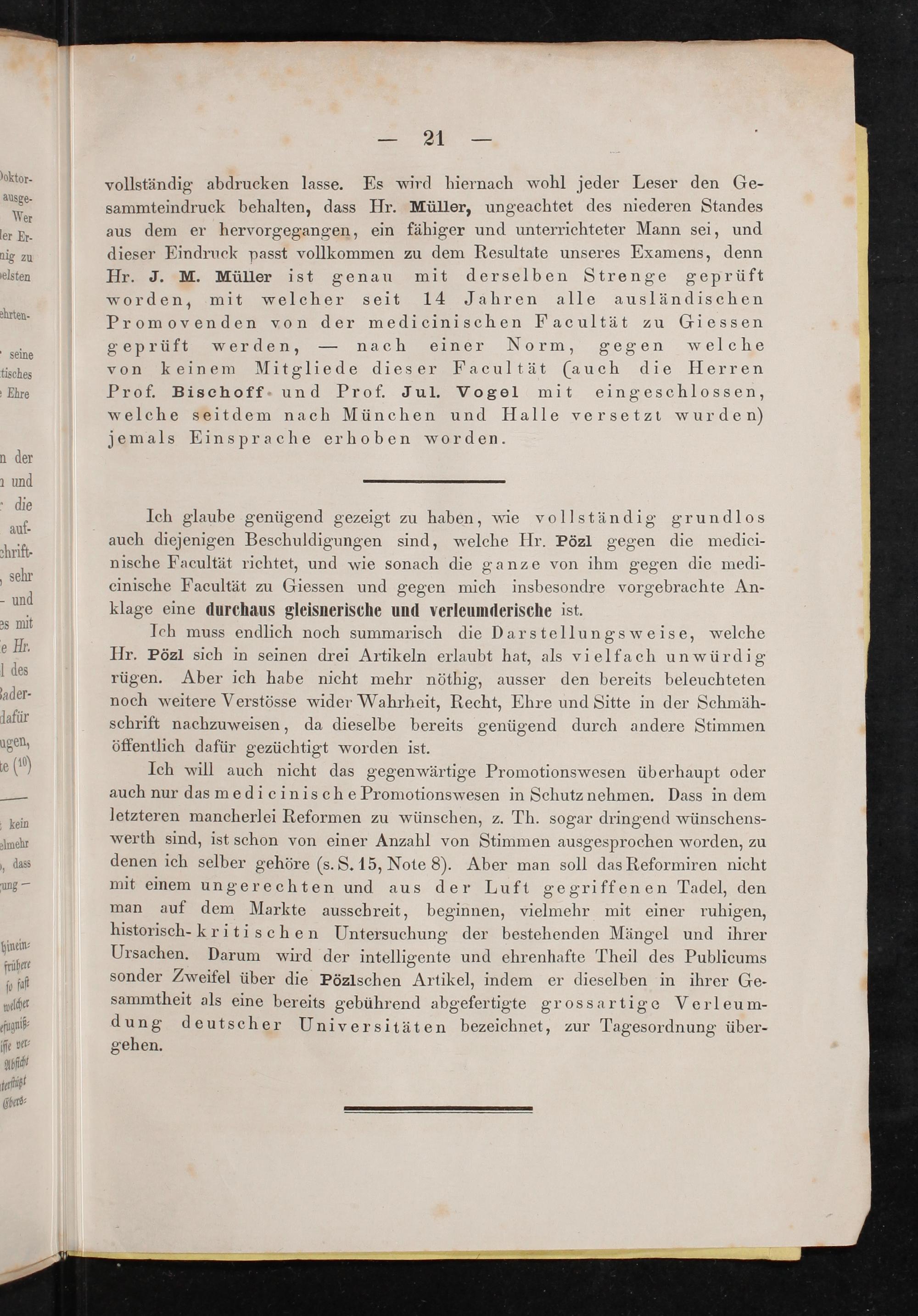 vollständig abdrucken lasse. Es wird hiernach wohl jeder Leser den Ge- sammteindruck behalten, dass Hr. Müller, ungeachtet des niederen Standes aus dem er hervorgegangen, ein fähiger und unterrichteter Mann sei, und dieser Eindruck passt vollkommen zu dem Resultate unseres Examens, denn Hr. J. M. Müller ist genau mit derselben Strenge geprüft worden, mit welcher seit 14 Jahren alle ausländischen Promovenden von der medicinischen Facultät zu Giessen geprüft werden,— nach einer Norm, gegen welche von keinem Mitgliede dieser Facultät(auch die Herren Prof. Bischoff. und Prof. Jul. Vogel mit eingeschlossen, welche seitdem nach München und Halle versetzt wurden) jemals Einsprache erhoben worden.