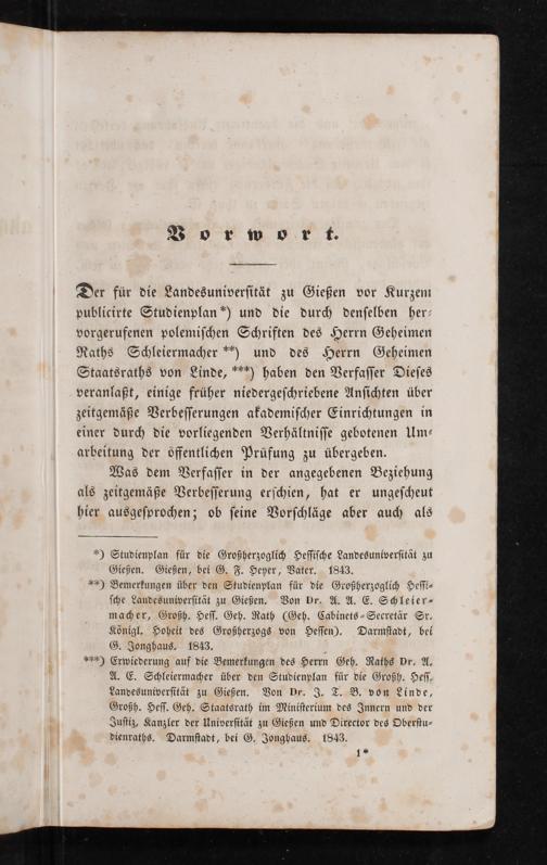 Der für die Landesuniverſität zu Gießen vor Kurzem publicirte Studienplan*) und die durch denſelben her— vorgerufenen polemiſchen Schriften des Herrn Geheimen Raths Schleiermacher**) und des Herrn Geheimen Staatsraths von Linde,**) haben den Verfaſſer Dieſes veranlaßt, einige früher niedergeſchriebene Anſichten über zeitgemäße Verbeſſerungen akademiſcher Einrichtungen in einer durch die vorliegenden Verhältniſſe gebotenen Um— arbeitung der öffentlichen Prüfung zu übergeben.