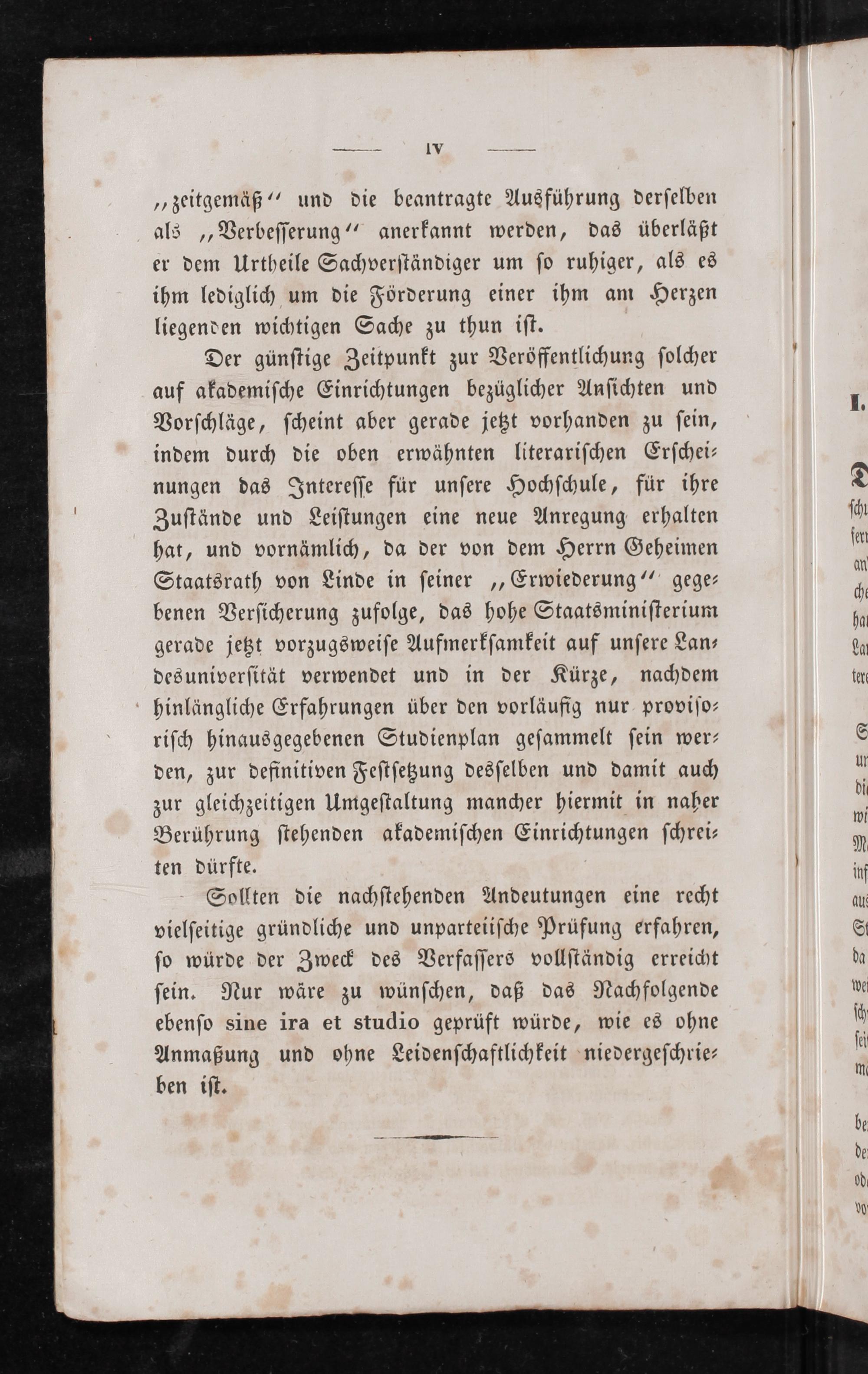 Der günſtige Zeitpunkt zur Veröffentlichung ſolcher auf akademiſche Einrichtungen bezüglicher Anſichten und Vorſchläge, ſcheint aber gerade jetzt vorhanden zu ſein, indem durch die oben erwähnten literariſchen Erſchei⸗ nungen das Intereſſe für unſere Hochſchule, für ihre Zuſtände und Leiſtungen eine neue Anregung erhalten hat, und vornämlich, da der von dem Herrn Geheimen Staatsrath von Linde in ſeiner„Erwiederung“ gege— benen Verſicherung zufolge, das hohe Staatsminiſterium gerade jetzt vorzugsweiſe Aufmerkſamkeit auf unſere Lan⸗ desuniverſität verwendet und in der Kürze, nachdem hinlängliche Erfahrungen über den vorläufig nur proviſo⸗ riſch hinausgegebenen Studienplan geſammelt ſein wer— den, zur definitiven Feſtſetzung desſelben und damit auch zur gleichzeitigen Umgeſtaltung mancher hiermit in naher Berührung ſtehenden akademiſchen Einrichtungen ſchrei— ten dürfte.