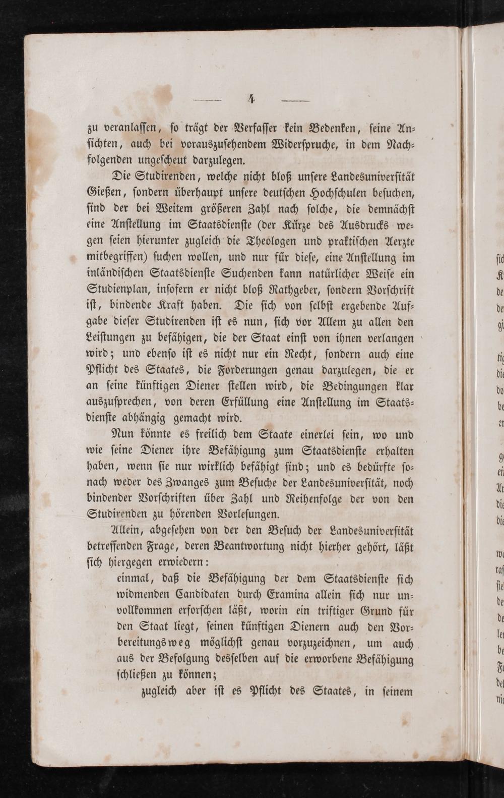Nun könnte es freilich dem Staate einerlei ſein, wo und wie ſeine Diener ihre Befähigung zum Staatsdienſte erhalten haben, wenn ſie nur wirklich befähigt ſind; und es bedürfte ſo⸗ nach weder des Zwanges zum Beſuche der Landesuniverſität, noch bindender Vorſchriften über Zahl und Reihenfolge der von den Studirenden zu hörenden Vorleſungen.