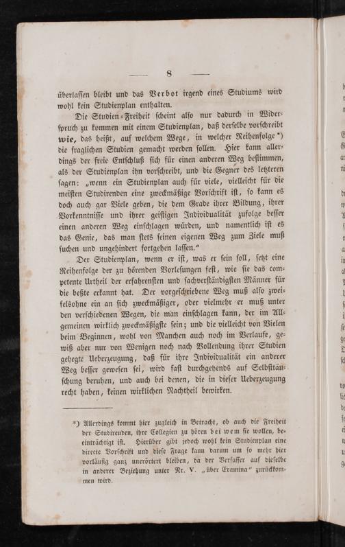 Die Studien⸗Freiheit ſcheint alſo nur dadurch in Wider⸗ ſpruch zu kommen mit einem Studienplan, daß derſelbe vorſchreibt wie, das heißt, auf welchem Wege, in welcher Reihenfolge*) die fraglichen Studien gemacht werden ſollen. Hier kann aller⸗ dings der freie Entſchluß ſich für einen anderen Weg beſtimmen, als der Studienplan ihn vorſchreibt, und die Gegner des letzteren ſagen:„wenn ein Studienplan auch für viele, vielleicht für die meiſten Studirenden eine zweckmäßige Vorſchrift iſt, ſo kann es doch auch gar Viele geben, die dem Grade ihrer Bildung, ihrer
