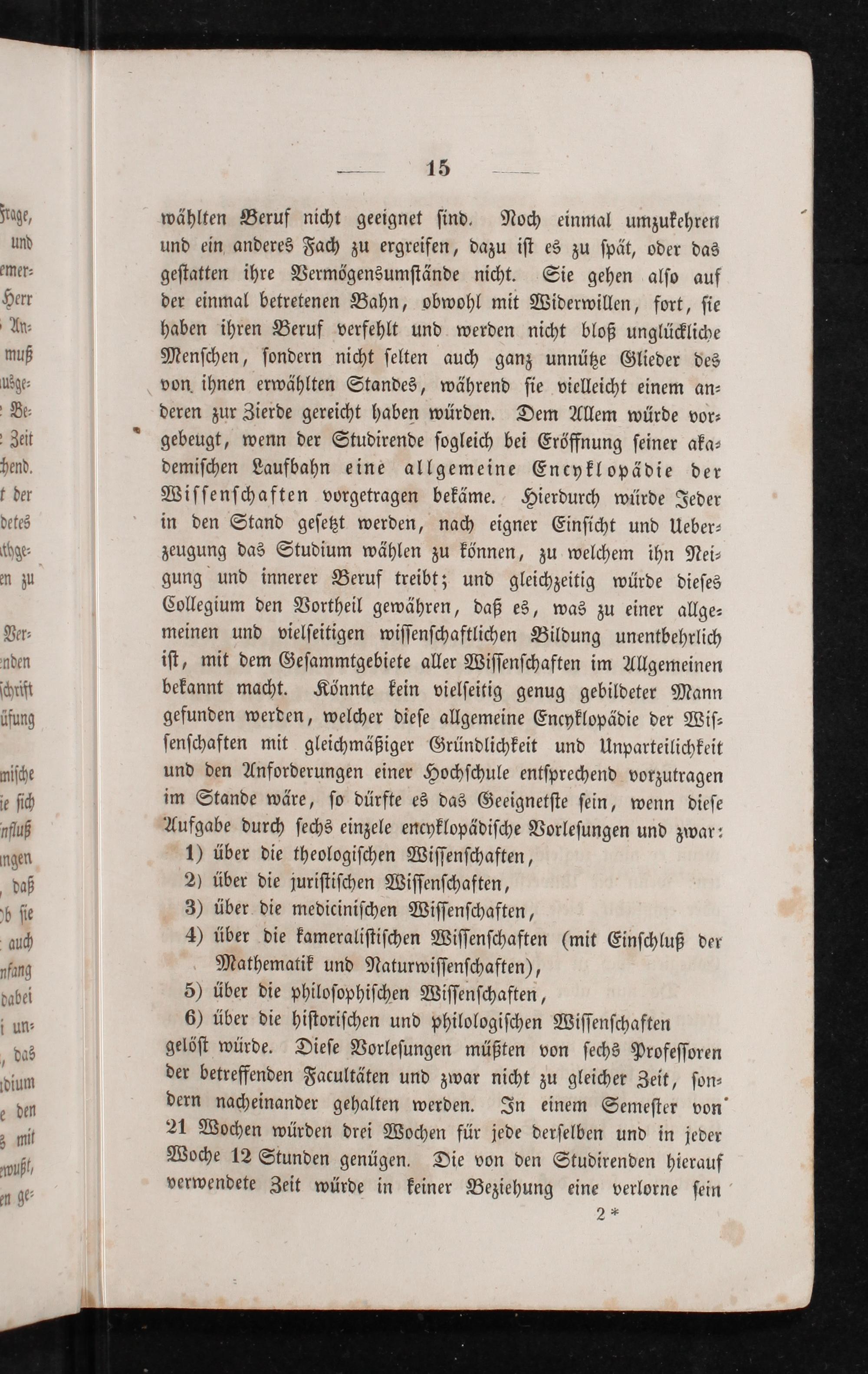 wählten Beruf nicht geeignet ſind. Noch einmal umzukehren und ein anderes Fach zu ergreifen, dazu iſt es zu ſpät, oder das geſtatten ihre Vermögensumſtände nicht. Sie gehen alſo auf der einmal betretenen Bahn, obwohl mit Widerwillen, fort, ſie haben ihren Beruf verfehlt und werden nicht bloß unglückliche Menſchen, ſondern nicht ſelten auch ganz unnütze Glieder des von ihnen erwählten Standes, während ſie vielleicht einem an⸗ deren zur Zierde gereicht haben würden. Dem Allem würde vor⸗ gebeugt, wenn der Studirende ſogleich bei Eröffnung ſeiner aka⸗ demiſchen Laufbahn eine allgemeine Encyklopädie der Wiſſenſchaften vorgetragen bekäme. Hierdurch würde Jeder in den Stand geſetzt werden, nach eigner Einſicht und Ueber⸗ zeugung das Studium wählen zu können, zu welchem ihn Nei— gung und innerer Beruf treibt; und gleichzeitig würde dieſes Collegium den Vortheil gewähren, daß es, was zu einer allge⸗ meinen und vielſeitigen wiſſenſchaftlichen Bildung unentbehrlich iſt, mit dem Geſammtgebiete aller Wiſſenſchaften im Allgemeinen bekannt macht. Könnte kein vielſeitig genug gebildeter Mann gefunden werden, welcher dieſe allgemeine Encyklopädie der Wiſ⸗ ſenſchaften mit gleichmäßiger Gründlichkeit und Unparteilichkeit und den Anforderungen einer Hochſchule entſprechend vorzutragen im Stande wäre, ſo dürfte es das Geeignetſte ſein, wenn dieſe Aufgabe durch ſechs einzele encyklopädiſche Vorleſungen und zwar: