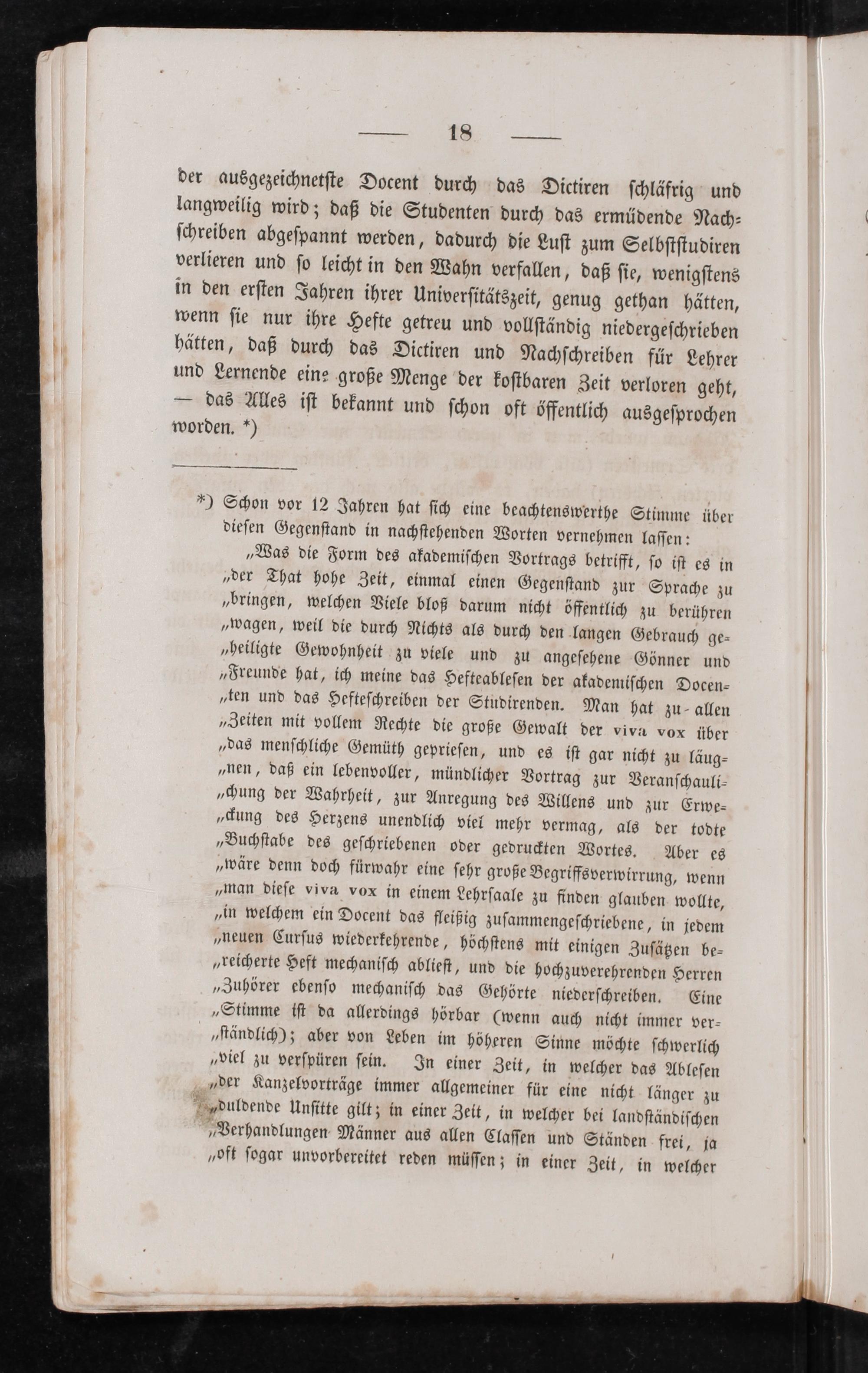 „der That hohe Zeit, einmal einen Gegenſtand zur Sprache zu „bringen, welchen Viele bloß darum nicht öffentlich zu berühren „wagen, weil die durch Nichts als durch den langen Gebrauch ge⸗ „heiligte Gewohnheit zu viele und zu angeſehene Gönner und „Freunde hat, ich meine das Hefteableſen der akademiſchen Docen⸗ „ten und das Hefteſchreiben der Studirenden. Man hat zu allen „Zeiten mit vollem Rechte die große Gewalt der viva vox über „das menſchliche Gemüth geprieſen, und es iſt gar nicht zu läug⸗ nen, daß ein lebenvoller, mündlicher Vortrag zur Veranſchauli⸗ „chung der Wahrheit, zur Anregung des Willens und zur Erwe⸗ „ckung des Herzens unendlich viel mehr vermag, als der todte „Buchſtabe des geſchriebenen oder gedruckten Wortes. Aber es „wäre denn doch fürwahr eine ſehr große Begriffsverwirrung, wenn „man dieſe viva vox in einem Lehrſaale zu finden glauben wollte, „in welchem ein Docent das fleißig zuſammengeſchriebene „neuen Curſus wiederkehrende, höchſtens mit einigen Zuſätzen be⸗ „reicherte Heft mechaniſch ablieſt, und die hochzuverehrenden Herren „Zuhörer ebenſo mechaniſch das Gehörte niederſchreiben. Eine „Stimme iſt da allerdings hörbar(wenn auch nicht immer ver⸗ „ſtändlich); aber von Leben im höheren Sinne möchte ſchwerlich „viel zu verſpüren ſein. In einer Zeit, in welcher das Ableſen „der Kanzelvorträge immer allgemeiner für eine nicht länger zu „duldende Unſitte gilt; in einer Zeit, in welcher bei landſtändiſchen Verhandlungen Männer aus allen Claſſen und Ständen frei, ja „oft ſogar unvorbereitet reden müſſen; in einer Zeit, in welcher