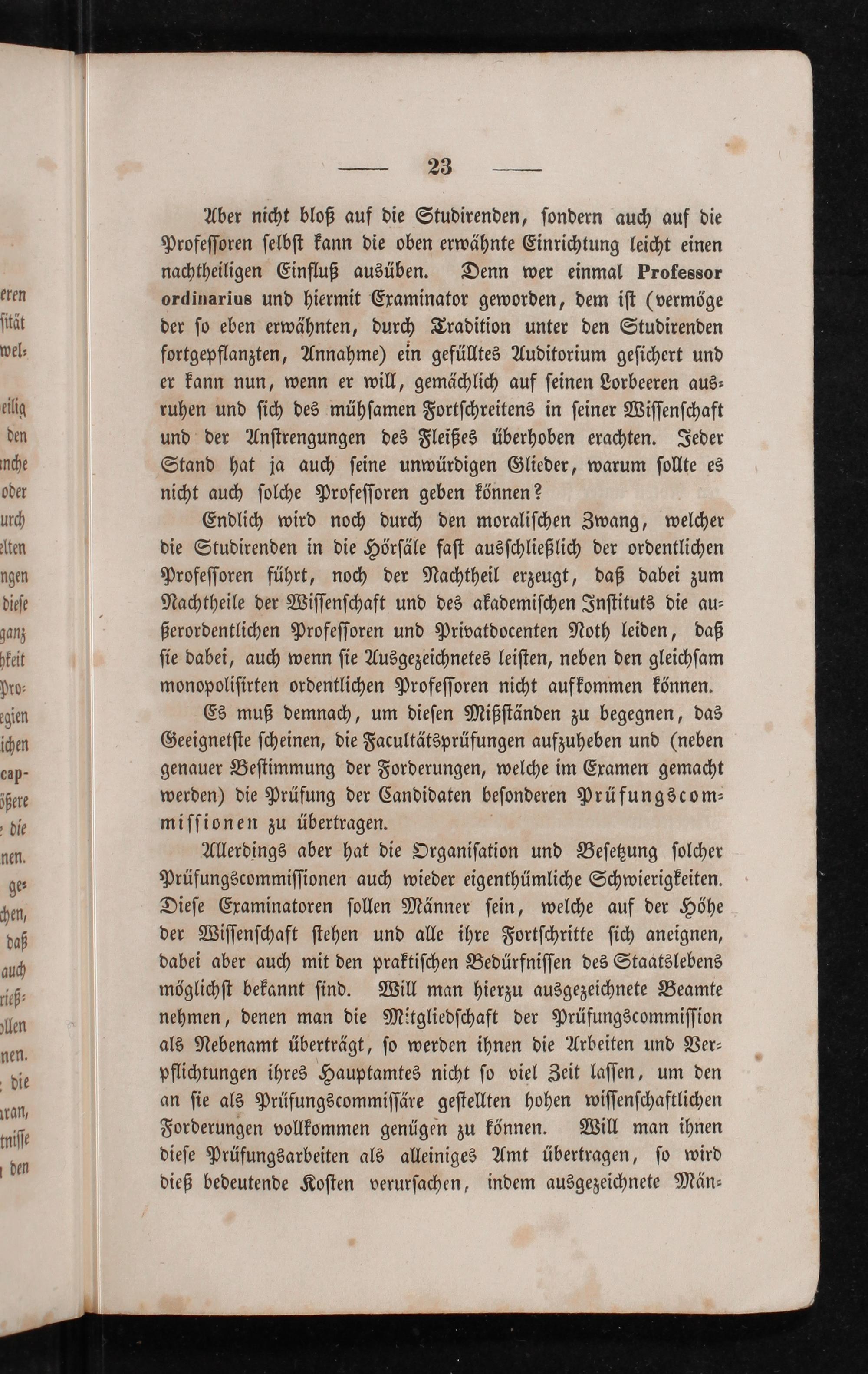 Endlich wird noch durch den moraliſchen Zwang, welcher die Studirenden in die Hörſäle faſt ausſchließlich der ordentlichen Profeſſoren führt, noch der Nachtheil erzeugt, daß dabei zum Nachtheile der Wiſſenſchaft und des akademiſchen Inſtituts die au⸗ ßerordentlichen Profeſſoren und Privatdocenten Noth leiden, daß ſie dabei, auch wenn ſie Ausgezeichnetes leiſten, neben den gleichſam monopoliſirten ordentlichen Profeſſoren nicht aufkommen können.