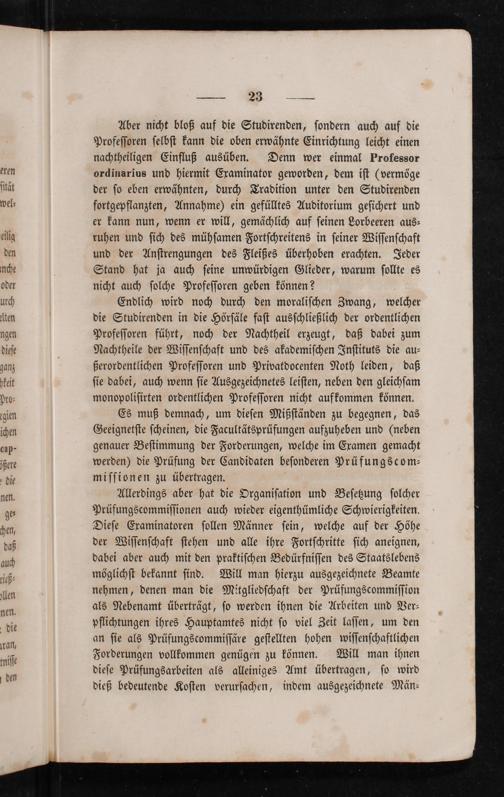 Aber nicht bloß auf die Studirenden, ſondern auch auf die Profeſſoren ſelbſt kann die oben erwähnte Einrichtung leicht einen nachtheiligen Einfluß ausüben. Denn wer einmal Professor ordinarius und hiermit Examinator geworden, dem iſt(vermöge der ſo eben erwähnten, durch Tradition unter den Studirenden fortgepflanzten, Annahme) ein gefülltes Auditorium geſichert und er kann nun, wenn er will, gemächlich auf ſeinen Lorbeeren aus⸗ ruhen und ſich des mühſamen Fortſchreitens in ſeiner Wiſſenſchaft und der Anſtrengungen des Fleißes überhoben erachten. Jeder Stand hat ja auch ſeine unwürdigen Glieder, warum ſollte es nicht auch ſolche Profeſſoren geben können?