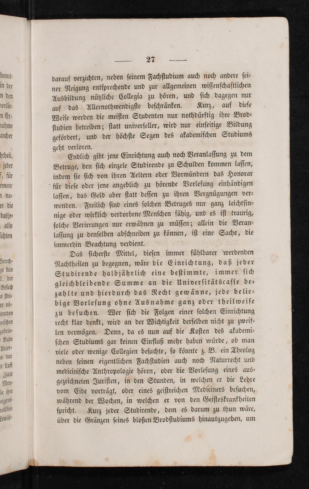 Das ſicherſte Mittel, dieſen immer fühlbarer werdenden Nachtheilen zu begegnen, wäre die Einrichtung, daß jeder Studirende halbjährlich eine beſtimmte, immer ſich gleichbleibende Summe an die Univerſitätscaſſe be⸗ zahlte und hierdurch das Recht gewänne, jede belie⸗ bige Vorleſung ohne Ausnahme ganz oder theilweiſe zu beſuchen. Wer ſich die Folgen einer ſolchen Einrichtung recht klar denkt, wird an der Wichtigkeit derſelben nicht zu zweif⸗ len vermögen. Denn, da es nun auf die Koſten des akademi⸗ ſchen Studiums gar keinen Einfluß mehr haben würde, ob man viele oder wenige Collegien beſuchte, ſo könnte z. B. ein Theolog neben ſeinen eigentlichen Fachſtudien auch noch Naturrecht und mediciniſche Anthropologie hören, oder die Vorleſung eines aus⸗ gezeichneten Juriſten, in den Stunden, in welchen er die Lehre vom Eide vorträgt, oder eines geiſtreichen Mediciners beſuchen, während der Wochen, in welchen er von den Geiſteskrankheiten ſpricht. Kurz jeder Studirende, dem es darum zu thun wäre, über die Gränzen ſeines bloßen Brodſtudiums hinauszugeben, um