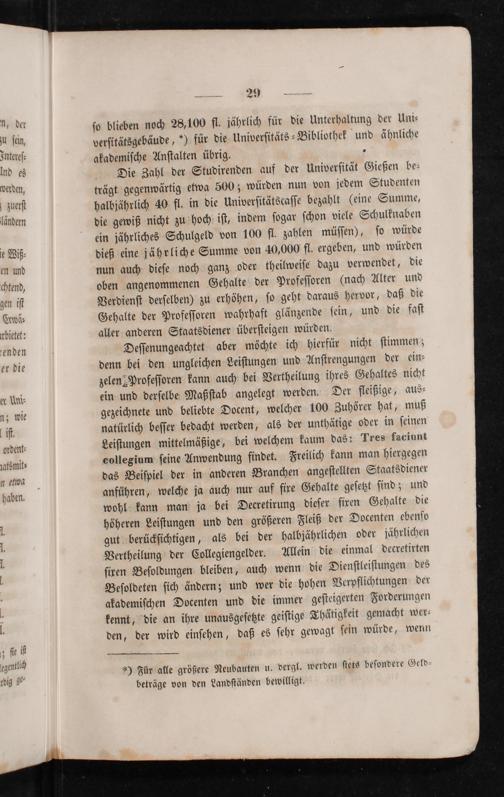 Die Zahl der Studirenden auf der Univerſität Gießen be⸗ trägt gegenwärtig etwa 500; würden nun von jedem Studenten halbjährlich 40 fl. in die Univerſitätscaſſe bezahlt(eine Summe, die gewiß nicht zu hoch iſt, indem ſogar ſchon viele Schulknaben ein jährliches Schulgeld von 100 fl. zahlen müſſen), ſo würde dieß eine jährliche Summe von 40,000 fl. ergeben, und würden nun auch dieſe noch ganz oder theilweiſe dazu verwendet, die oben angenommenen Gehalte der Profeſſoren(nach Alter und Verdienſt derſelben) zu erhöhen, ſo geht daraus hervor, daß die Gehalte der Profeſſoren wahrhaft glänzende ſein, und die faſt aller anderen Staatsdiener überſteigen würden.