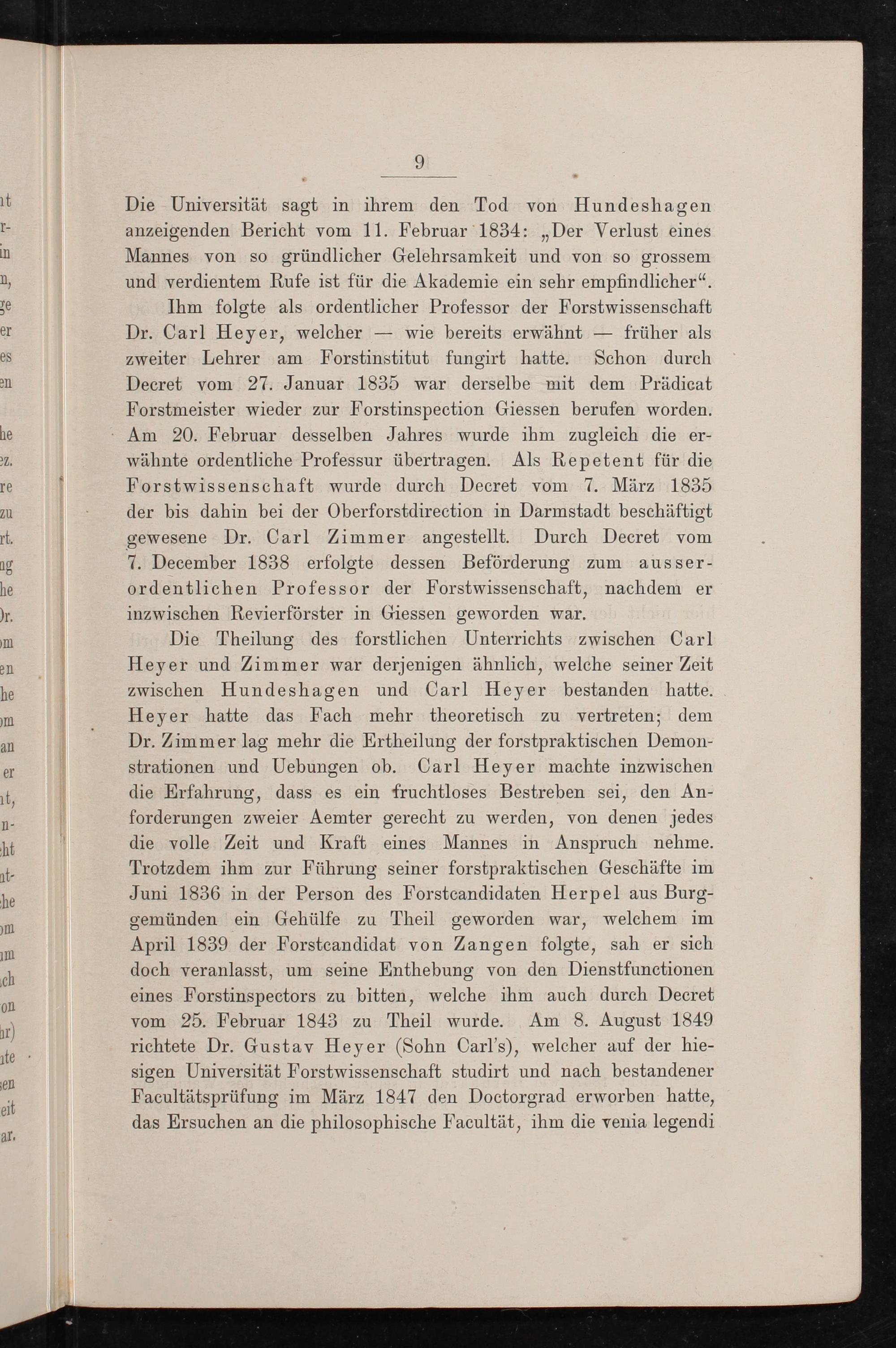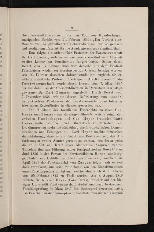 Ihm folgte als ordentlicher Professor der Forstwissenschaft Dr. Carl Heyer, welcher— wie bereits erwähnt— früher als zweiter Lehrer am Forstinstitut fungirt hatte. Schon durch Decret vom 27. Januar 1835 war derselbe mit dem Präcdicat Forstmeister wieder zur Forstinspection Giessen berufen worden. Am 20. Februar desselben Jahres wurde ihm zugleich die er- wähnte ordentliche Professur übertragen. Als Repetent für die Forstwissenschaft wurde durch Decret vom 7. März 1835 der bis dahin bei der Oberforstdirection in Darmstadt beschäftigt gewesene Dr. Carl Zimmer angestellt. Durch Decret vom 7. December 1838 erfolgte dessen Beförderung zum ausser- ordentlichen Professor der Forstwissenschaft, nachdem er inzwischen Revierförster in Giessen geworden war.