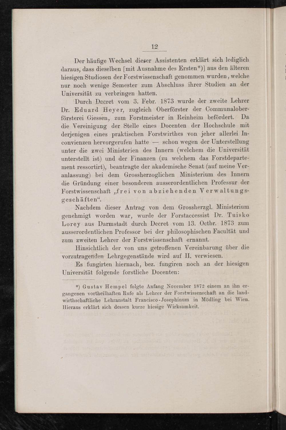 Nachdem dieser Antrag von dem Grossherzgl. Ministerium genehmigt worden war, wurde der Forstaccessist Dr. Tuisko Lorey aus Darmstadt durch Decret vom 13. Octbr. 1873 zum ausserordentlichen Professor bei der philosophischen Facultät und zum zweiten Lehrer der Forstwissenschaft ernannt.