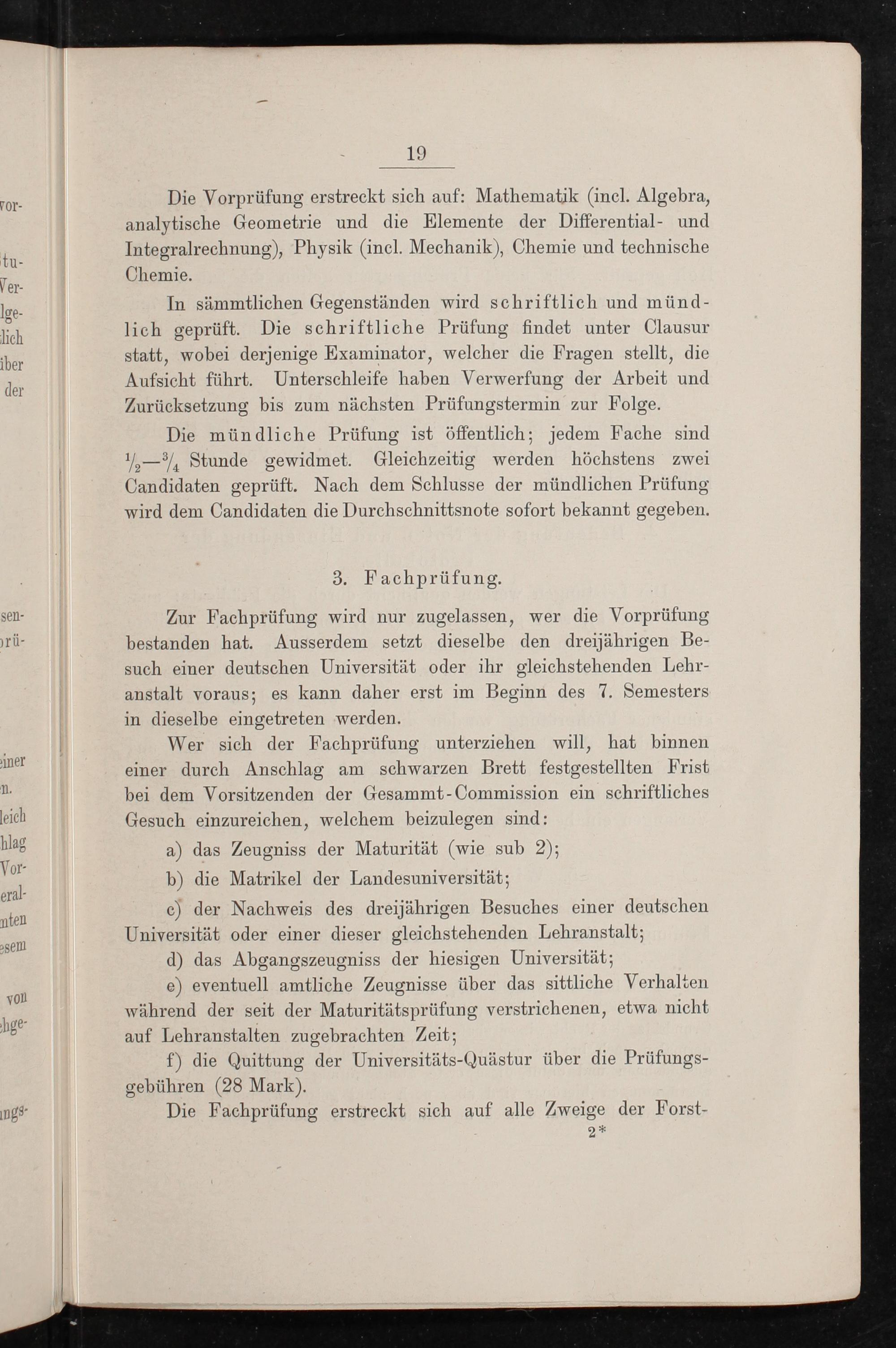 Zur Fachprüfung wird nur zugelassen, wer die Vorprüfung bestanden hat. Ausserdem setzt dieselbe den dreijährigen Be- such einer deutschen Universität oder ihr gleichstehenden Lehr- anstalt voraus; es kann daher erst im Beginn des 7. Semesters in dieselbe eingetreten werden.