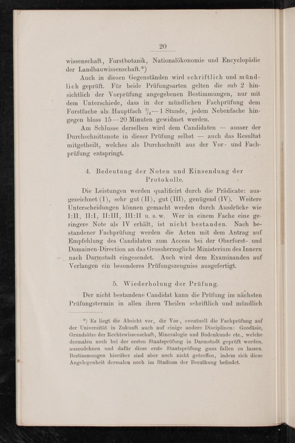 *) Es liegt die Absicht vor, die Vor-, eventuell die Fachprüfung auf der Universität in Zukunft auch auf einige andere Disciplinen: Geodäsie, Grundsätze der Rechtswissenschaft, Mineralogie und Bodenkunde etc., welche dermalen noch bei der ersten Staatsprüfung in Darmstadt geprüft werden, auszudehnen und dafür diese erste Staatsprüfung ganz fallen zu lassen. Bestimmungen hierüber sind aber noch nicht getroffen, indem sich diese Angelegenheit dermalen noch im Stadium der Berathung befindet.