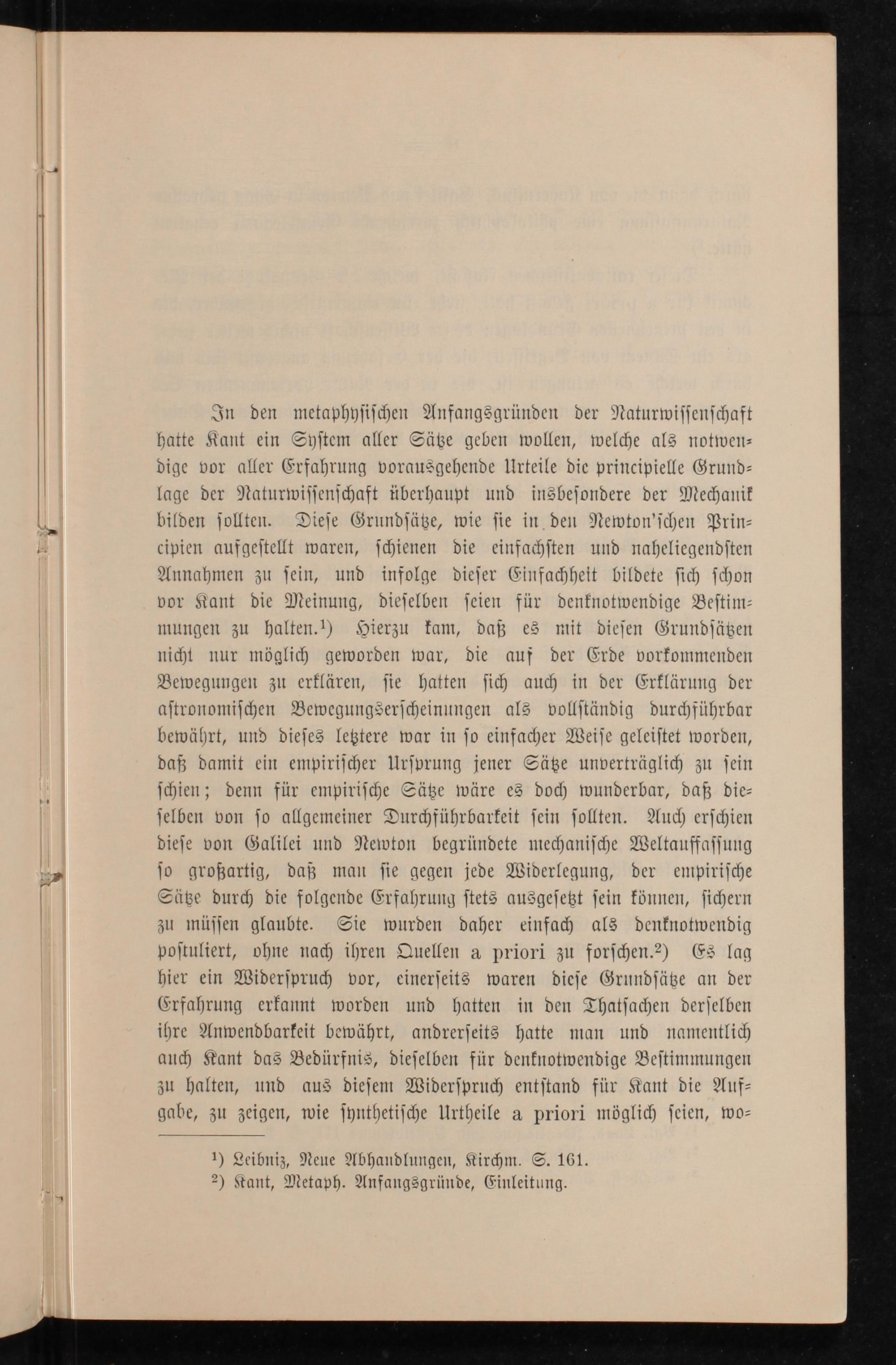 In den metaphyſiſchen Anfangsgründen der Naturwiſſenſchaft hatte Kant ein Syſtem aller Sätze geben wollen, welche als notwen⸗ dige vor aller Erfahrung vorausgehende Urteile die principielle Grund⸗ lage der Naturwiſſenſchaft überhaupt und insbeſondere der Mechanik bilden ſollten. Dieſe Grundſätze, wie ſie in den Newton'ſchen Prin⸗ cipien aufgeſtellt waren, ſchienen die einfachſten und naheliegendſten Annahmen zu ſein, und infolge dieſer Einfachheit bildete ſich ſchon vor Kant die Meinung, dieſelben ſeien für denknotwendige Beſtim⸗ mungen zu halten.¹) Hierzu kam, daß es mit dieſen Grundſätzen nicht nur möglich geworden war, die auf der Erde vorkommenden Bewegungen zu erklären, ſie hatten ſich auch in der Erklärung der aſtronomiſchen Bewegungserſcheinungen als vollſtändig durchführbar bewährt, und dieſes letztere war in ſo einfacher Weiſe geleiſtet worden, daß damit ein empiriſcher Urſprung jener Sätze unverträglich zu ſein ſchien; denn für empiriſche Sätze wäre es doch wunderbar, daß die⸗ ſelben von ſo allgemeiner Durchführbarkeit ſein ſollten. Auch erſchien dieſe von Galilei und Newton begründete mechaniſche Weltauffaſſung ſo großartig, daß man ſie gegen jede Widerlegung, der empiriſche Sätze durch die folgende Erfahrung ſtets ausgeſetzt ſein können, ſichern zu müſſen glaubte. Sie wurden daher einfach als denknotwendig poſtuliert, ohne nach ihren Quellen a priori zu forſchen.2) Es lag hier ein Widerſpruch vor, einerſeits waren dieſe Grundſätze an der Erfahrung erkannt worden und hatten in den Thatſachen derſelben ihre Anwendbarkeit bewährt, andrerſeits hatte man und namentlich auch Kant das Bedürfnis, dieſelben für denknotwendige Beſtimmungen zu halten, und aus dieſem Widerſpruch entſtand für Kant die Auf⸗ gabe, zu zeigen, wie ſynthetiſche Urtheile a priori möglich ſeien, wo⸗