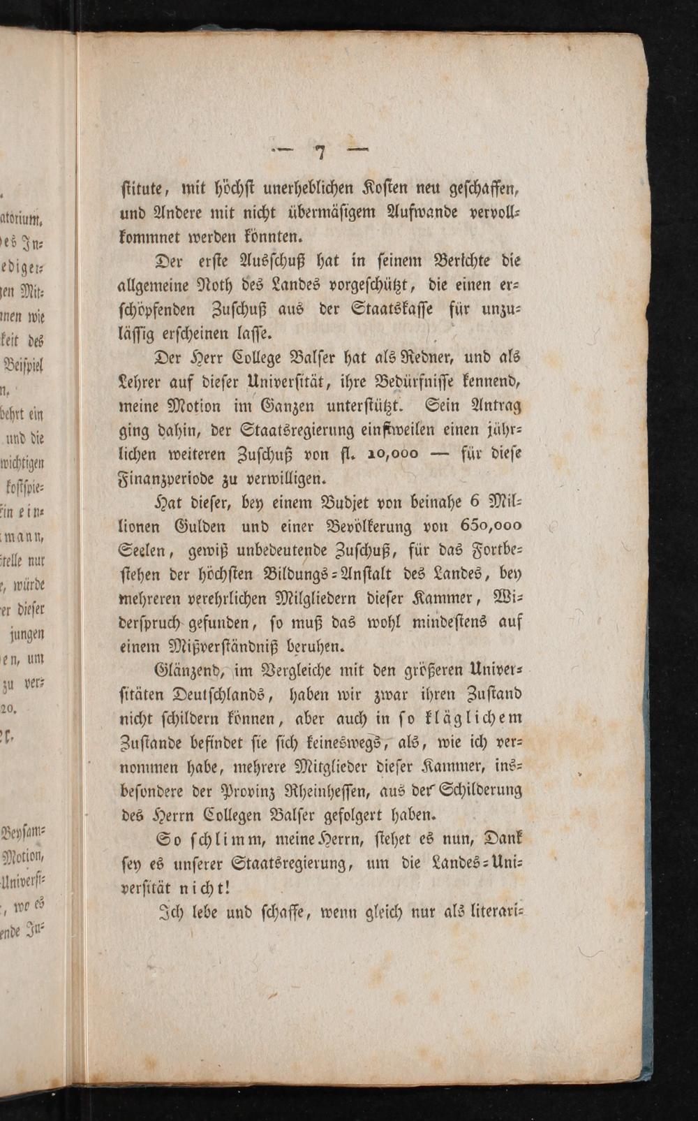 Glänzend, im Vergleiche mit den größeren Univer⸗ ſitäten Deutſchlands, haben wir zwar ihren Zuſtand nicht ſchildern können, aber auch in ſo kläglichem Zuſtande befindet ſie ſich keineswegs, als, wie ich ver⸗ nommen habe, mehrere Mitglieder dieſer Kammer, ins⸗ beſondere der Provinz Rheinheſſen, aus der Schilderung des Herrn Collegen Balſer gefolgert haben.