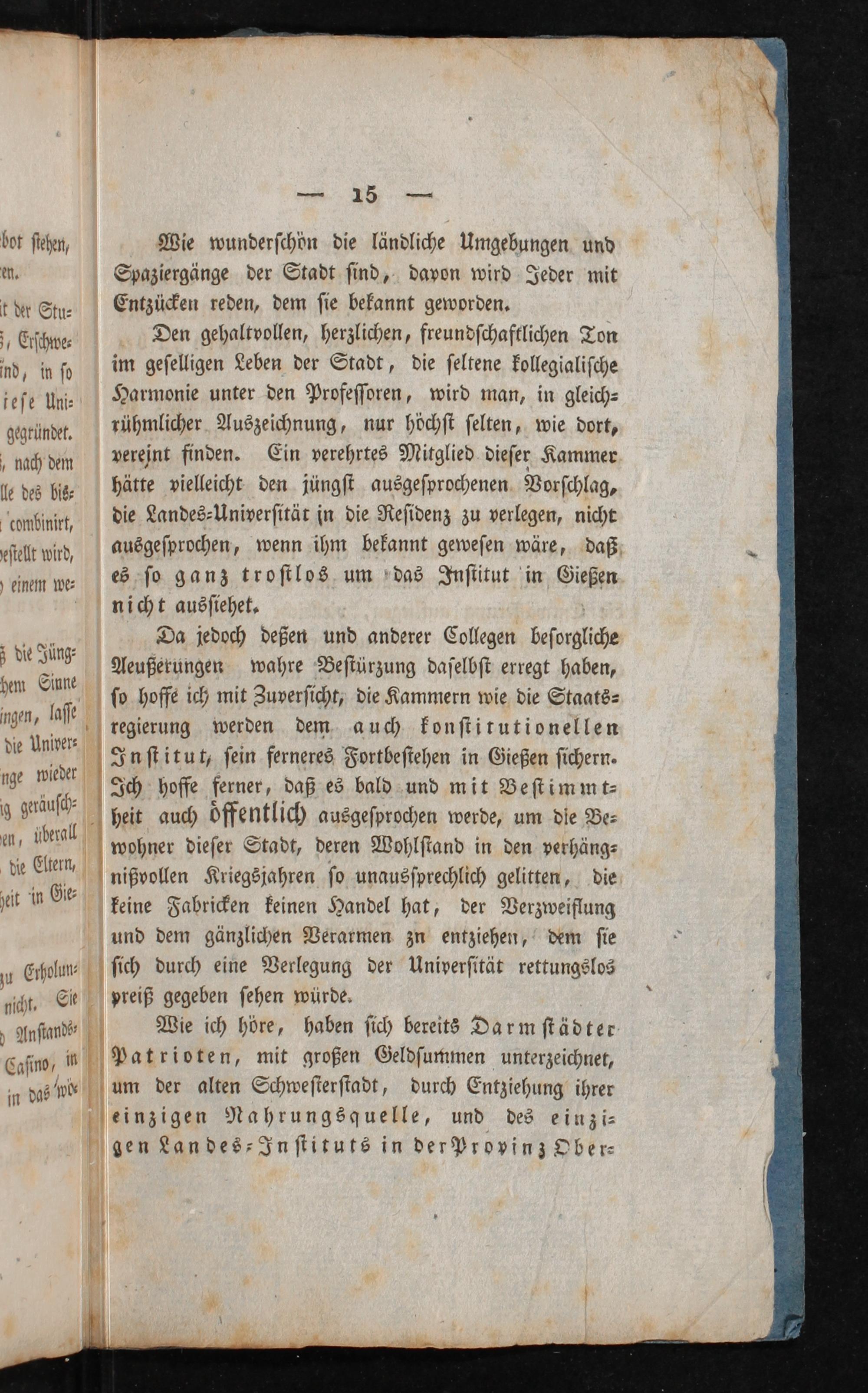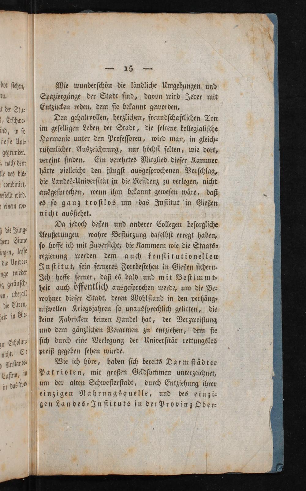 Inſtitut, ſein ferneres Fortbeſtehen in Gießen ſichern⸗ Ich hoffe ferner, daß es bald und mit Beſtimmt⸗ heit auch oͤffentlich ausgeſprochen werde, um die Be⸗ wohner dieſer Stadt, deren Wohlſtand in den perhäng⸗ nißvollen Kriegsjahren ſo unausſprechlich gelitten, die keine Fabricken keinen Handel hat, der Verzweiflung und dem gänzlichen Verarmen zu entziehen, dem ſie ſich durch eine Verlegung der Univerſität rettungslos preiß gegeben ſehen würde. Wie ich höre, haben ſich bereits Darm ſtädter