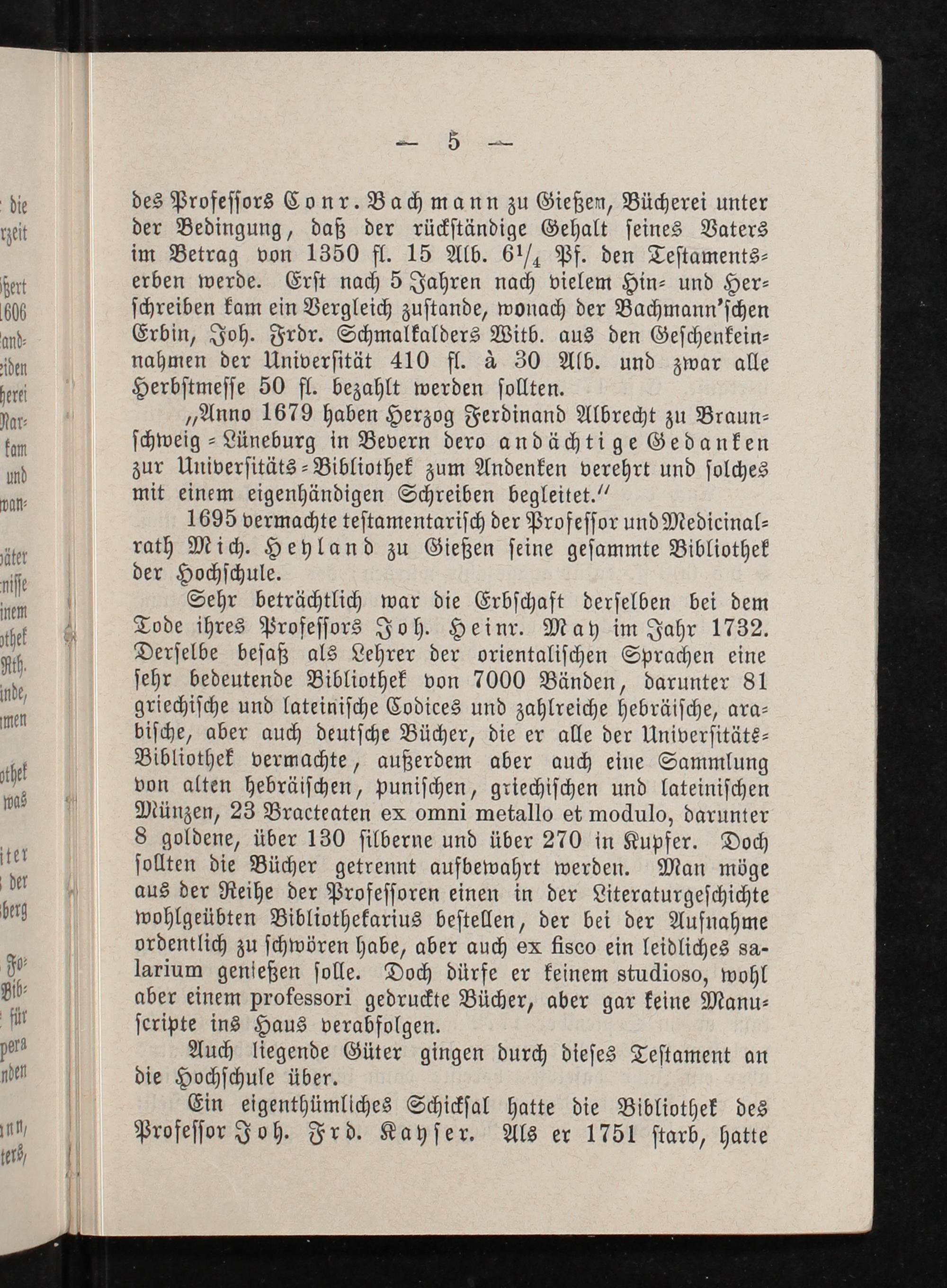 des Profeſſors Conr. Bachmann zu Gießen, Bücherei unter der Bedingung, daß der rückſtändige Gehalt ſeines Vaters im Betrag von 1350 fl. 15 Alb. 6 ½¼ Pf. den Teſtaments⸗ erben werde. Erſt nach 5 Jahren nach vielem Hin⸗ und Her⸗ ſchreiben kam ein Vergleich zuſtande, wonach der Bachmann'ſchen Erbin, Joh. Frdr. Schmalkalders Witb. aus den Geſchenkein⸗ nahmen der Univerſität 410 fl. à 30 Alb. und zwar alle Herbſtmeſſe 50 fl. bezahlt werden ſollten.