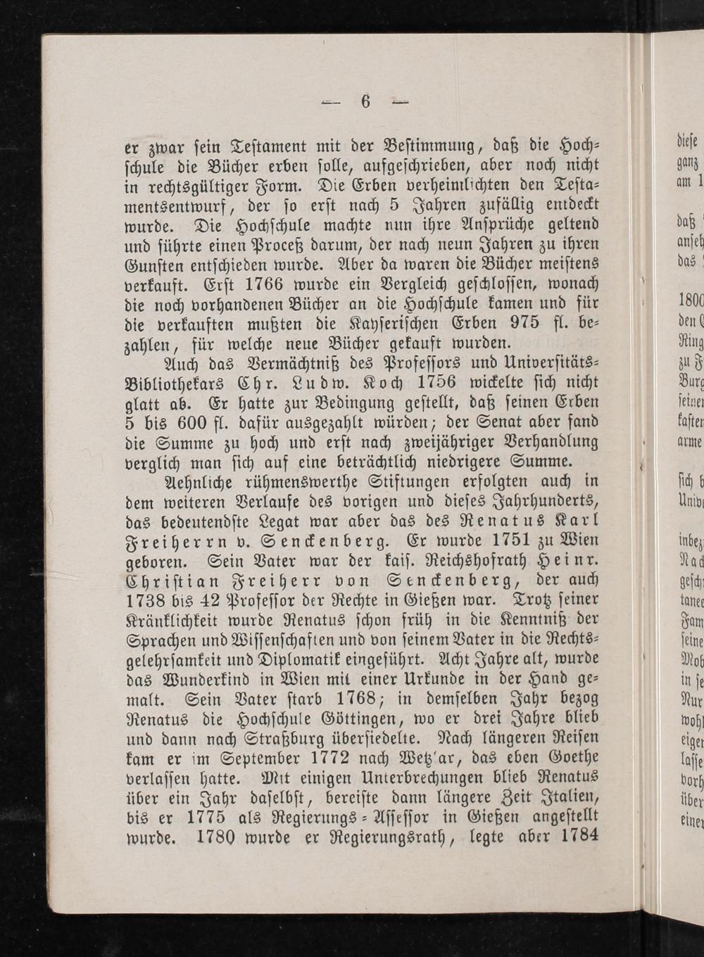 Aehnliche rühmenswerthe Stiftungen erfolgten auch in dem weiteren Verlaufe des vorigen und dieſes Jahrhunderts, das bedeutendſte Legat war aber das des Renatus Karl Freiherrn v. Senckenberg. Er wurde 1751 zu Wien geboren. Sein Vater war der kaiſ. Reichshofrath Heinr. Chriſtian Freiherr von Senckenberg, der auch 1738 bis 42 Profeſſor der Rechte in Gießen war. Trotz ſeiner Kränklichkeit wurde Renatus ſchon früh in die Kenntniß der Sprachen und Wiſſenſchaften und von ſeinem Vater in die Rechts⸗ gelehrſamkeit und Diplomatik eingeſührt. Acht Jahre alt, wurde das Wunderkind in Wien mit einer Urkunde in der Hand ge⸗ malt. Sein Vater ſtarb 1768; in demſelben Jahr bezog Renatus die Hochſchule Göttingen, wo er drei Jahre blieb und dann nach Straßburg überſiedelte. Nach längeren Reiſen kam er im September 1772 nach Wetz'ar, das eben Goethe verlaſſen hatte. Mit einigen Unterbrechungen blieb Renatus über ein Jahr daſelbſt, bereiſte dann längere Zeit Italien, bis er 1775 als Regierungs⸗Aſſeſſor in Gießen angeſtellt wurde. 1780 wurde er Regierungsrath, legte aber 1784