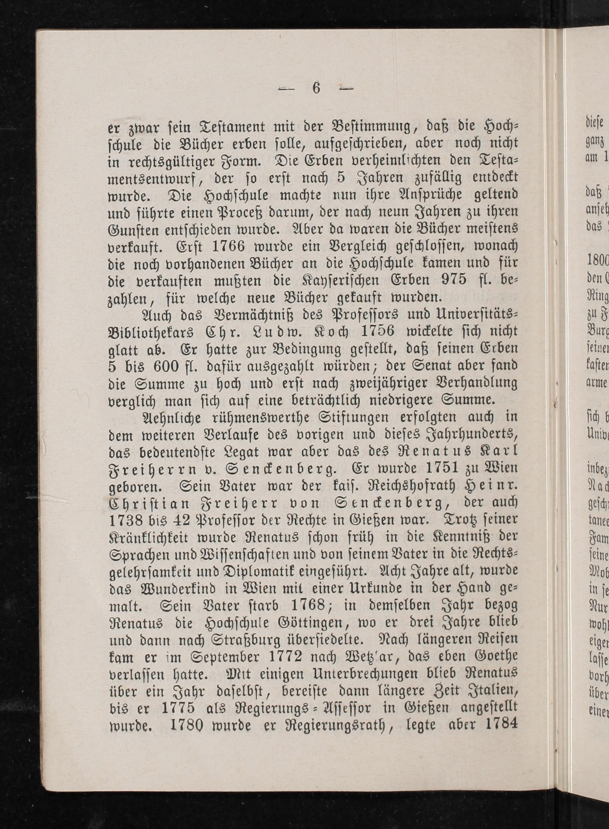Auch das Vermächtniß des Profeſſors und Univerſitäts⸗ Bibliothekars Chr. Ludw. Koch 1756 wickelte ſich nicht glatt ab. Er hatte zur Bedingung geſtellt, daß ſeinen Erben 5 bis 600 fl. dafür ausgezahlt würden; der Senat aber fand die Summe zu hoch und erſt nach zweijähriger Verhandlung verglich man ſich auf eine beträchtlich niedrigere Summe.