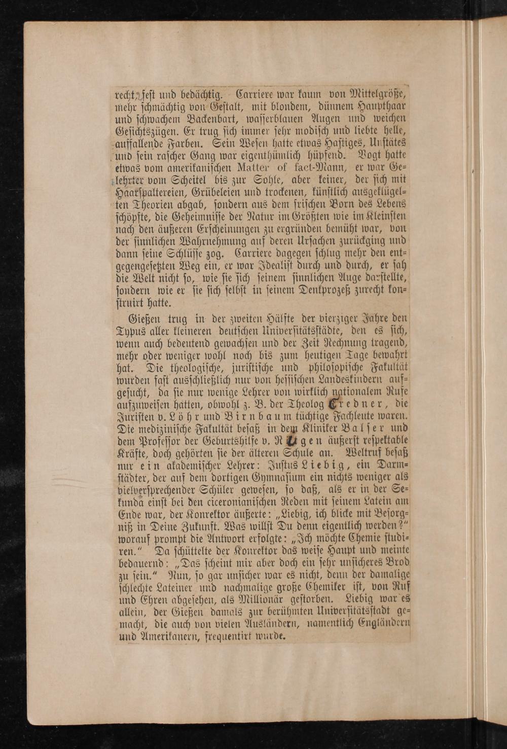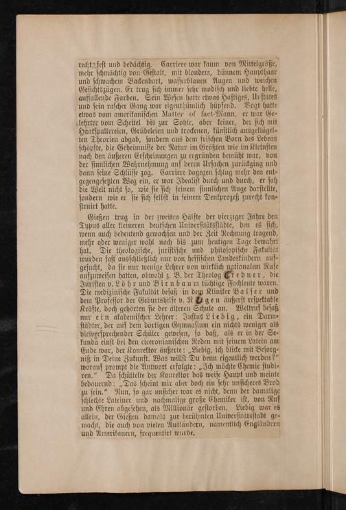 zu ſein.“ Nun, ſo gar unſicher war es nicht, denn der damalige ſchlechte Lateiner und nachmalige große Chemiker iſt, von Ruf und Ehren abgeſehen, als Millionär geſtorben. Liebig war es allein, der Gießen damals zur berühmten Univerſitätsſtadt ge⸗ macht, die auch von vielen Ausländern, namentlich Engländern und Amerikanern, frequentirt wurde.