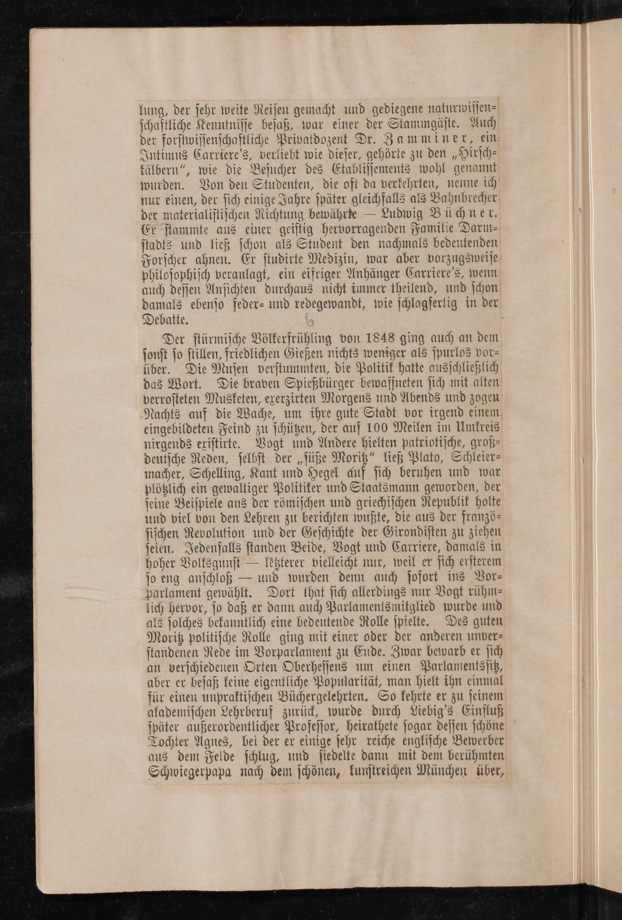 Der ſtürmiſche Völkerfrühling von 1848 ging auch an dem ſonſt ſo ſtillen, friedlichen Gießen nichts weniger als ſpurlos vor⸗ über. Die Muſen verſtummten, die Politik hatte ausſchließlich das Wort. Die braven Spießbürger bewaffneten ſich mit alten verroſteten Musketen, exerzirten Morgens und Abends und zogen Nachts auf die Wache, um ihre gute Stadt vor irgend einem eingebildeten Feind zu ſchützen, der auf 100 Meilen im Umkreis nirgends exiſtirte. Vogt und Andere hielten patriotiſche, groß⸗ deutſche Reden, ſelbſt der„ſüße Moritz“ ließ Plato, Schleier⸗ macher, Schelling, Kant und Hegel auf ſich beruhen und war plötzlich ein gewaltiger Politiker und Staatsmann geworden, der ſeine Beiſpiele aus der römiſchen und griechiſchen Republik holte und viel von den Lehren zu berichten wußte, die aus der franzö⸗ ſiſchen Revolution und der Geſchichte der Girondiſten zu ziehen ſeien. Jedenfalls ſtanden Beide, Vogt und Carriere, damals in hoher Volksgunſt— letzterer vielleicht nur, weil er ſich erſterem ſo eng anſchloß— und wurden denn auch ſofort ins Vor⸗ parlament gewählt. Dort that ſich allerdings nur Vogt rühm⸗ lich hervor, ſo daß er dann auch Parlamentsmitglied wurde und als ſolches bekanntlich eine bedeutende Rolle ſpielte. Des guten Moritz politiſche Rolle ging mit einer oder der anderen unver⸗ ſtandenen Rede im Vorparlament zu Ende. Zwar bewarb er ſich an verſchiedenen Orten Oberheſſens um einen Parlamentsſitz, aber er beſaß keine eigentliche Popularität, man hielt ihn einmal für einen unpraktiſchen Büchergelehrten. So kehrte er zu ſeinem alademiſchen Lehrberuf zurück, wurde durch Liebig's Einfluß ſpäter außerordentlicher Profeſſor, heirathete ſogar deſſen ſchöne Tochter Agnes, bei der er einige ſehr reiche engliſche Bewerber aus dem Felde ſchlug, und ſiedelte dann mit dem berühmten Schwiegerpapa nach dem ſchönen, kunſtreichen München über,