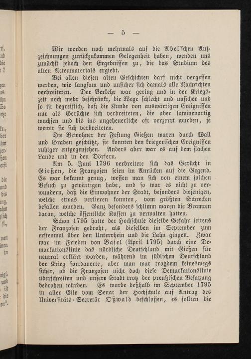 Schon 1795 hatte der Hochſchule dieſelbe Gefahr ſeitens der Franzoſen gedroht, als dieſelben im September zum erſtenmal über den Unterrhein und die Lahn gingen. Zwar war im Frieden von Baſel(April 1795) durch eine De⸗ markationslinie das nördliche Deutſchland mit Gießen für neutral erklärt worden, während im ſüdlichen Deutſchland der Krieg fortdauerte, aber man war trotzdem keineswegs ſicher, ob die Franzoſen nicht doch dieſe Demarkationslinie überſchreiten und unſere Stadt trotz der preußiſchen Beſatzung bedrohen würden. Es wurde deßhalb im September 1795 in aller Eile vom Senat der Hochſchule auf Antrag des Univerſitäts⸗Secretär Oßwald beſchloſſen, es ſollten die