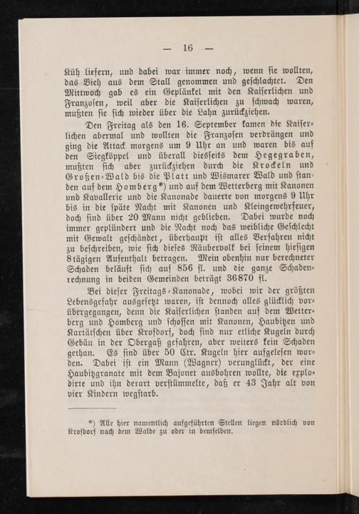 Den Freitag als den 16. September kamen die Kaiſer⸗ lichen abermal und wollten die Franzoſen verdrängen und ging die Attack morgens um 9 Uhr an und waren bis auf den Siegköppel und überall diesſeits dem Hegegraben, mußten ſich aber zurückziehen durch die Krockeln und Großen⸗Wald bis die Platt und Wismarer Wald und ſtan⸗ den auf dem Homberg*) und auf dem Wetterberg mit Kanonen und Kavallerie und die Kanonade dauerte von morgens 9 Uhr bis in die ſpäte Nacht mit Kanonen und Kleingewehrfeuer, doch ſind über 20 Mann nicht geblieben. Dabei wurde noch immer geplündert und die Nacht noch das weibliche Geſchlecht mit Gewalt geſchändet, überhaupt iſt alles Verfahren nicht zu beſchreiben, wie ſich dieſes Räubervolk bei ſeinem hieſigen Stägigen Aufenthalt betragen. Mein obenhin nur berechneter Schaden beläuft ſich auf 856 fl. und die ganze Schaden⸗ rechnung in beiden Gemeinden beträgt 36870 fl.