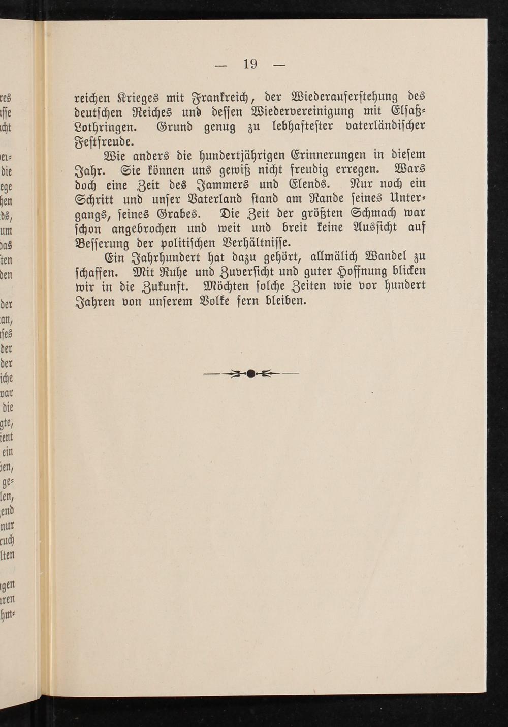 Ein Jahrhundert hat dazu gehört, allmälich Wandel zu ſchaffen. Mit Ruhe und Zuverſicht und guter Hoffnung blicken wir in die Zukunft. Möchten ſolche Zeiten wie vor hundert Jahren von unſerem Volke fern bleiben.