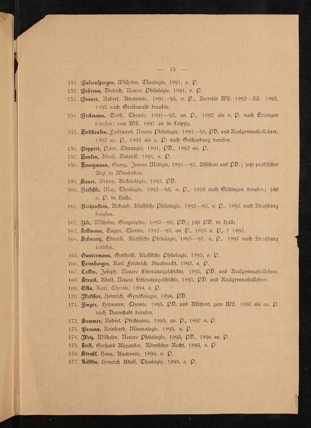 151. Galdenſperger, Wilhelm, Theologie, 1891, o. P. 152. Gehrens, Dietrich, Neuere Philologie, 1891, o. P. 153. Gonnet, Robert, Anatomie, 1801— 95, o. P., Secretär WS. 1892—S88. 1893,