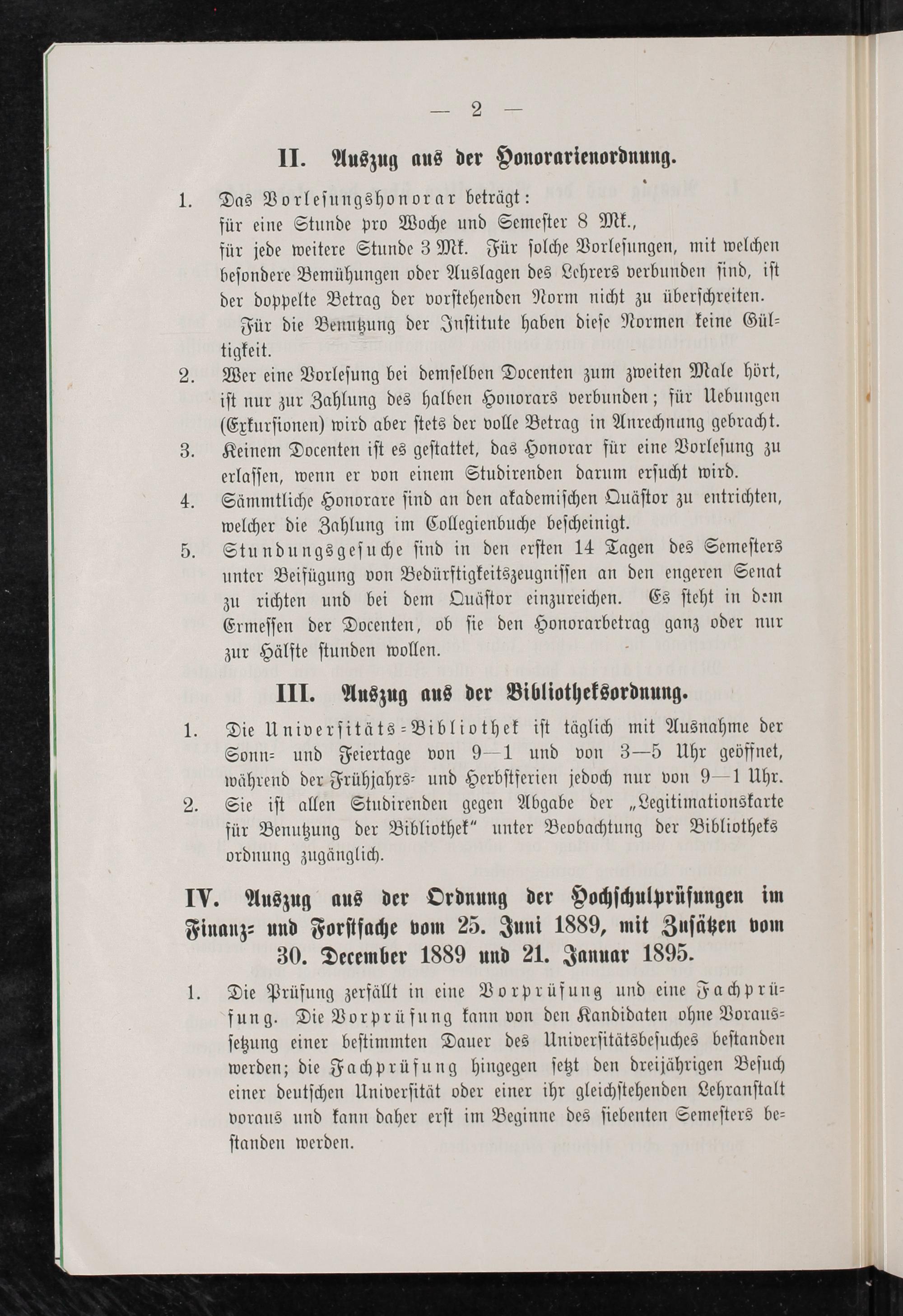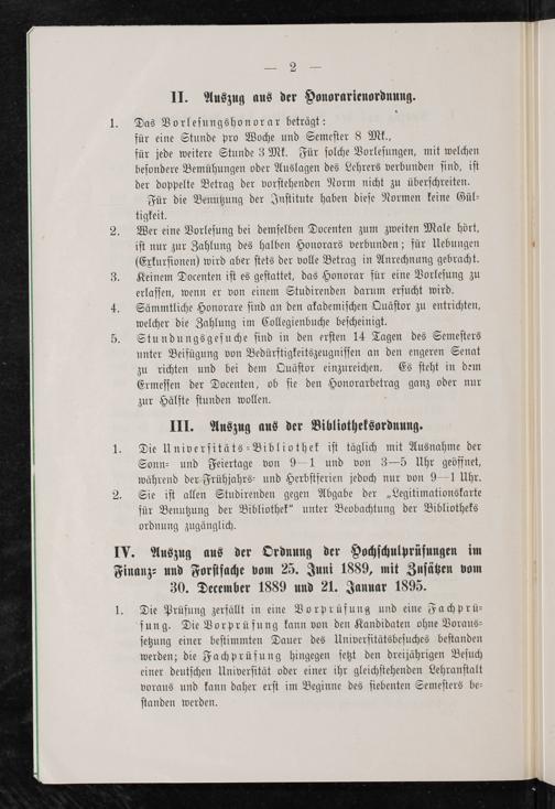 Das Vorleſungshonorar beträgt: für eine Stunde pro Woche und Semeſter 8 Mk., für jede weitere Stunde 3 Mk. Für ſolche Vorleſungen, mit welchen beſondere Bemühungen oder Auslagen des Lehrers verbunden ſind, iſt der doppelte Betrag der vorſtehenden Norm nicht zu überſchreiten. Für die Benutzung der Inſtitute haben dieſe Normen keine Gül⸗ tigkeit. Wer eine Vorleſung bei demſelben Docenten zum zweiten Male hört, iſt nur zur Zahlung des halben Honorars verbunden; für Uebungen (Exkurſionen) wird aber ſtets der volle Betrag in Anrechnung gebracht. Keinem Docenten iſt es geſtattet, das Honorar für eine Vorleſung zu erlaſſen, wenn er von einem Studirenden darum erſucht wird. Sämmtliche Honorare ſind an den akademiſchen Quäſtor zu entrichten, welcher die Zahlung im Collegienbuche beſcheinigt. Stundungsgeſuche ſind in den erſten 14 Tagen des Semeſters unter Beifügung von Bedürftigkeitszeugniſſen an den engeren Senat zu richten und bei dem Quäſtor einzureichen. Es ſteht in dem Ermeſſen der Docenten, ob ſie den Honorarbetrag ganz oder nur zur Hälfte ſtunden wollen.