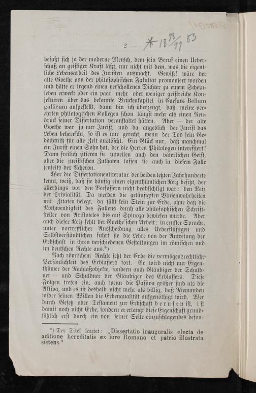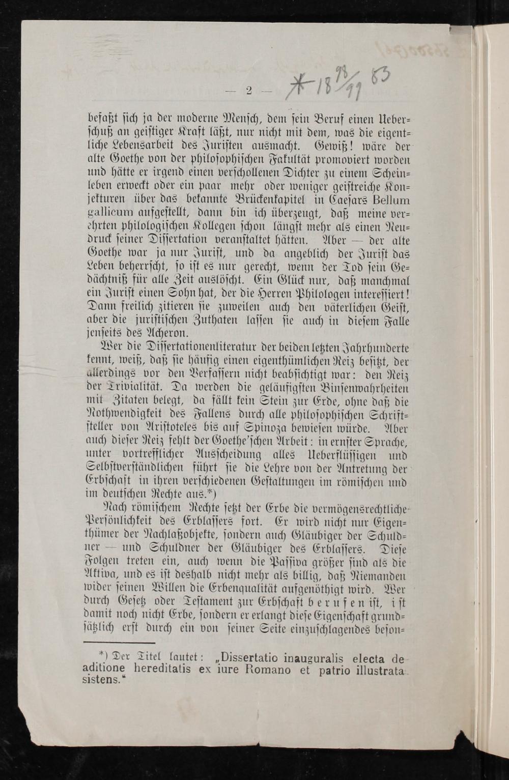 Wer die Diſſertationenliteratur der beiden letzten Jahrhunderte kennt, weiß, daß ſie häufig einen eigenthümlichen Reiz beſitzt, der allerdings vor den Verfaſſern nicht beabſichtigt war: den Reiz der Trivialität. Da werden die geläufigſten Binſenwahrheiten mit Zitaten belegt, da fällt kein Stein zur Erde, ohne daß die Nothwendigkeit des Fallens durch alle philoſophiſchen Schrift⸗ ſteller von Ariſtoteles bis auf Spinoza bewieſen würde. Aber auch dieſer Reiz fehlt der Goethe'ſchen Arbeit: in ernſter Sprache, unter vortrefflicher Ausſcheidung alles Ueberflüſſigen und Selbſtverſtändlichen führt ſie die Lehre von der Antretung der Erbſchaſt in ihren verſchiedenen Geſtaltungen im römiſchen und im deutſchen Rechte aus.*)