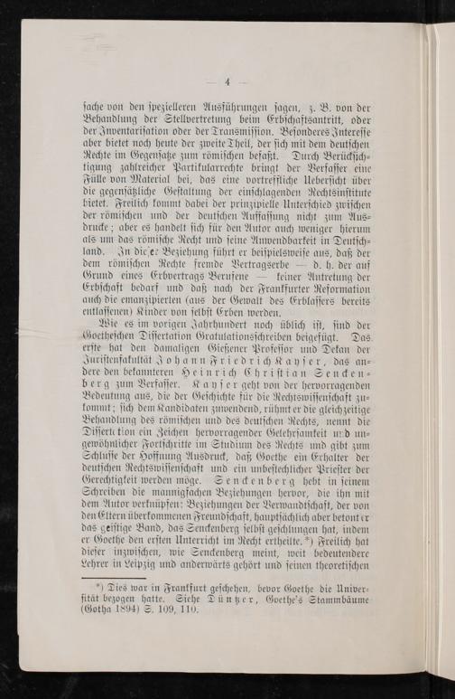 Diſſertation ein Zeichen hervorragender Gelehrſamkeit und un⸗ gewöh nlicher Fortſchritte im Studium des Rechts und gibt zum Schluſſe der Hoffnung Ausdruck, daß Goethe ein Erhalter der deutſchen Rechtswiſſenſchaft und ein unbeſtechlicher Prieſter der Gerechtigkeit werden möge. Senckenberg hebt in ſeinem Schreiben die mannigfachen Beziehungen hervor, die ihn mit dem Autor verknüpfen: Beziehungen der Verwandtſchaft, der von den Eltern überkommenen Freundſchaft, hauptſäch lich aber betont er das geiſtige Band, das Senckenberg ſelbſt geſchlungen hat, indem er Goethe den erſten Unterricht im Recht ertheilte.*) Freilich hat dieſer inzwiſchen, wie Senckenberg meint, weit bedeutendere Lehrer in Leipzig und anderwärts gehört und ſeinen theoretiſchen