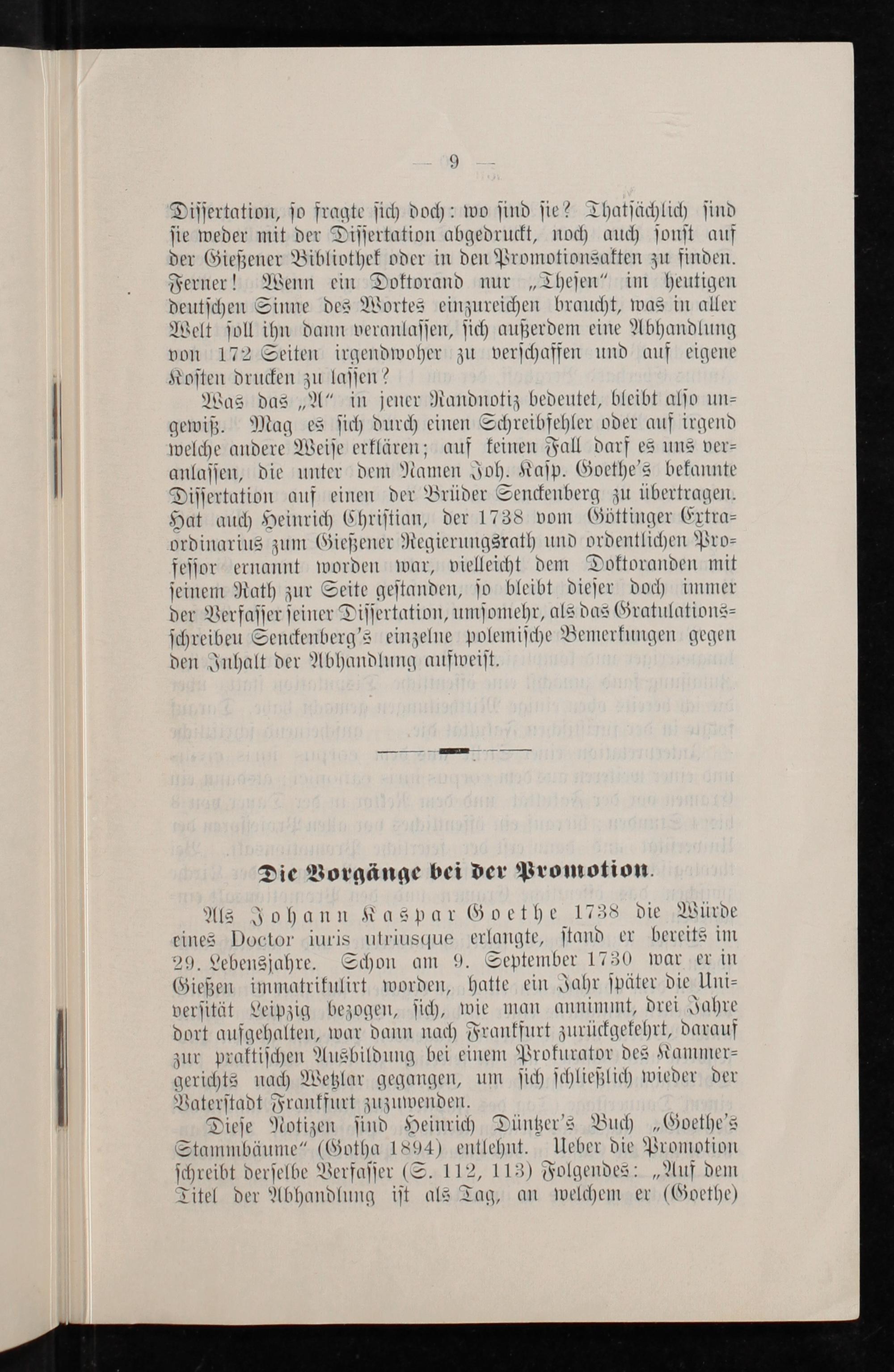 Dieſe Notizen ſind Heinrich Düntzer’s Buch„Goethe'’s Stammbäume“(Gotha 1894) entlehnt. Ueber die Promotion ſchreibt derſelbe Verfaſſer(S. 112, 113) Folgendes:„Auf dem Titel der Abhandlung iſt als Tag, an welchem er(Goethe)