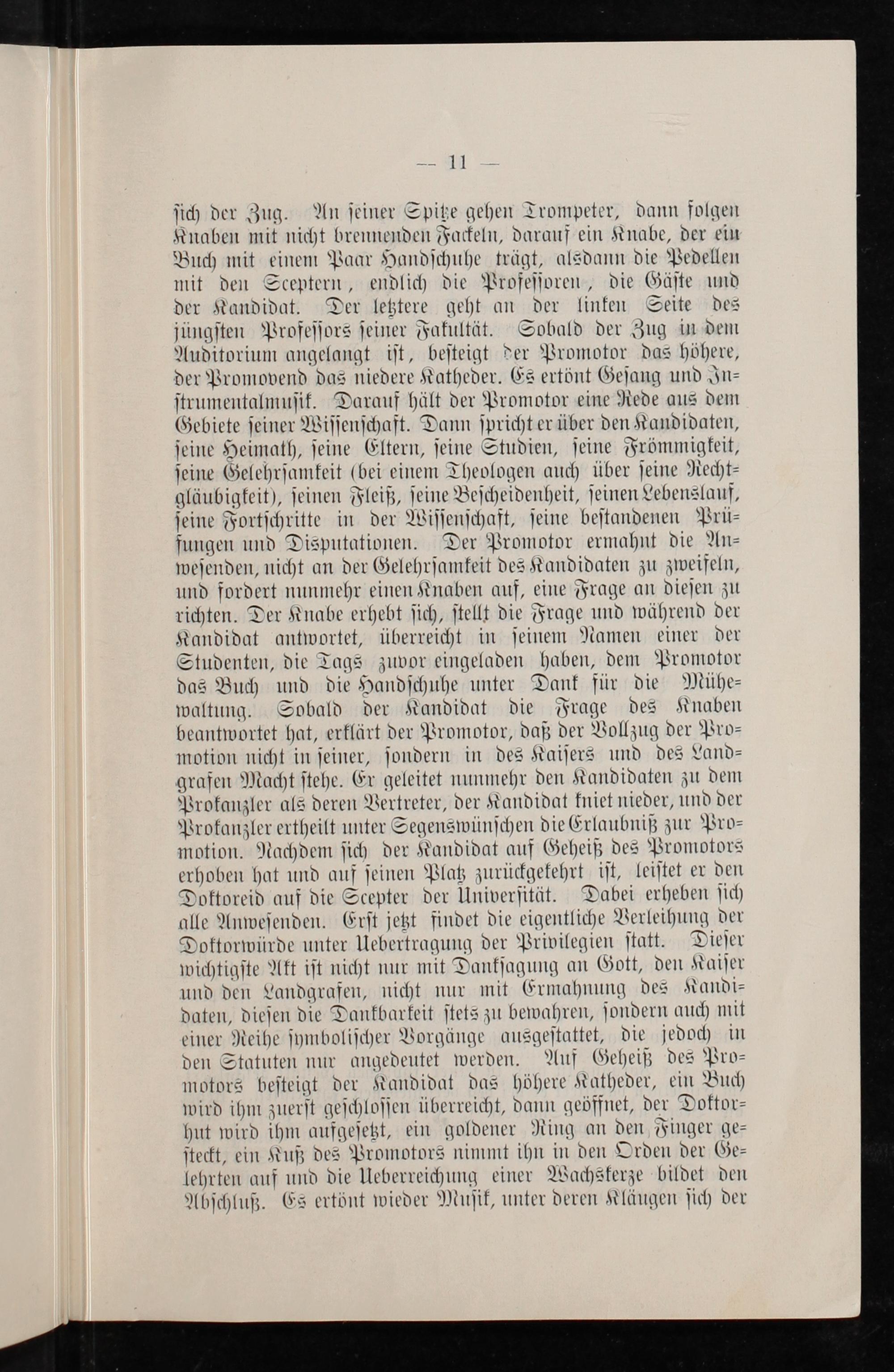 ſich der Zug. An ſeiner Spitze gehen Trompeter, dann folgen Knaben mit nicht brennenden Fackeln, darauf ein Knabe, der ein Buch mit einem Paar Handſchuhe trägt, alsdann die Pedellen mit den Sceptern, endlich die Profeſſoren, die Gäſte und der Kandidat. Der letztere geht an der linken Seite des jüngſten Profeſſors ſeiner Fakultät. Sobald der Zug in dem Auditorium angelangt iſt, beſteigt der Promotor das höhere, der Promovend das niedere Katheder. Es ertönt Geſang und In⸗ ſtrumentalmuſik. Darauf hält der Promotor eine Rede aus dem Gebiete ſeiner Wiſſenſchaft. Dann ſpricht er über den Kandidaten, ſeine Heimath, ſeine Eltern, ſeine Studien, ſeine Frömmigkeit, ſeine Gelehrſamkeit(bei einem Theologen auch über ſeine Recht⸗ gläubigkeit), ſeinen Fleiß, ſeine Beſcheidenheit, ſeinen Lebenslauf, ſeine Fortſchritte in der Wiſſenſchaft, ſeine beſtandenen Prü⸗ fungen und Disputationen. Der Promotor ermahnt die An⸗ weſenden, nicht an der Gelehrſamkeit des Kandidaten zu zweifeln, und fordert nunmehr einen Knaben auf, eine Frage an dieſen zu richten. Der Knabe erhebt ſich, ſtellt die Frage und während der Kandidat antwortet, überreicht in ſeinem Namen einer der Studenten, die Tags zuvor eingeladen haben, dem Promotor das Buch und die Handſchuhe unter Dank für die Mühe⸗ waltung. Sobald der Kandidat die Frage des Knaben beantwortet hat, erklärt der Promotor, daß der Vollzug der Pro⸗ motion nicht in ſeiner, ſondern in des Kaiſers und des Land⸗ grafen Macht ſtehe. Er geleitet nunmehr den Kandidaten zu dem Prokanzler als deren Vertreter, der Kandidat kniet nieder, und der Prokanzler ertheilt unter Segenswünſchen die Erlaubniß zur Pro⸗ motion. Nachdem ſich der Kandidat auf Geheiß des Promotors erhoben hat und auf ſeinen Platz zurückgekehrt iſt, leiſtet er den Doktoreid auf die Scepter der Univerſität. Dabei erheben ſich alle Anweſenden. Erſt jetzt findet die eigentliche Verleihung der